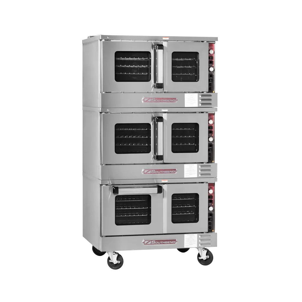 Enhance your commercial kitchen with the Southbend TVES/30SC Electric Convection Oven. This low-profile, triple-deck oven is designed to meet the demands of a busy restaurant. With its electronic ignition and solid state thermostatic controls, you can easily adjust the temperature from 150 to 550 degrees Fahrenheit to achieve perfect cooking results every time. The 60-minute mechanical cook timer ensures precise cooking times, while the oven interior light allows you to monitor your dishes without opening the door and losing heat. The cool-down fan helps to quickly cool the oven after use, allowing for faster turnaround times. This oven also includes three racks per oven, providing ample space for multiple dishes. With its porcelain oven interior and stainless steel construction, this oven is not only durable but also easy to clean. Trust Southbend to deliver a high-quality, reliable oven that will elevate your restaurant's cooking capabilities.