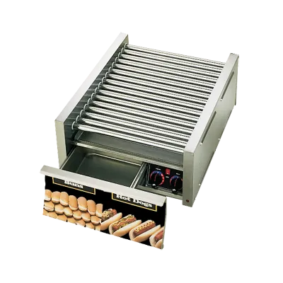 Maximize your food service potential with the Star 45STBD Hot Dog Grill. This roller-type grill is perfect for commercial restaurants, offering a capacity of 45 hot dogs and 32 buns. The ultra-durable StalTek coated non-stick rollers ensure that your hot dogs cook evenly and are easy to clean. The integrated bun drawer keeps your buns warm and ready to serve. With analog controls for the front and rear zones, you can easily adjust the temperature to achieve the perfect cooking results. The stainless steel construction not only adds a sleek and professional look to your restaurant, but it also ensures durability and longevity. This hot dog grill is cULus and UL EPH Classified, guaranteeing its safety and quality. Made in the USA by Star, a trusted vendor in the industry, the 45STBD Hot Dog Grill is a reliable and efficient addition to any commercial restaurant.