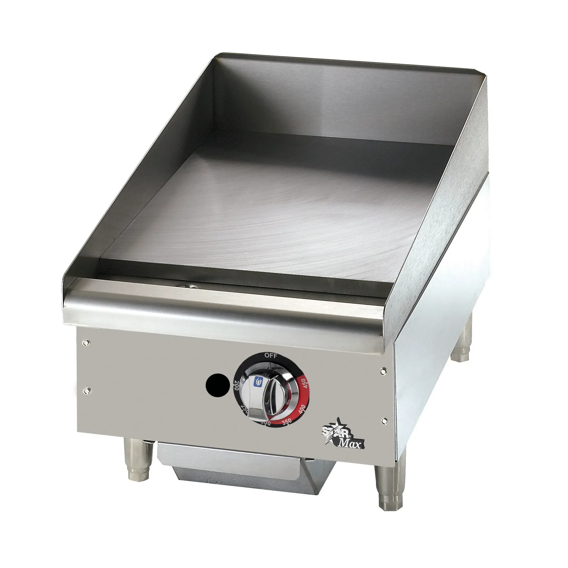 Fuel your restaurant's success with the Star 515TGF Electric Countertop Griddle. This heavy-duty griddle is designed to meet the demands of a busy commercial kitchen. With a 15" wide by 20-3/4" deep cooking surface, it provides ample space to cook a variety of dishes. The 1" thick polished griddle plate ensures even heat distribution and excellent heat retention, while the 150-450F snap-action thermostat allows for precise temperature control. The 4000 watt element every 12" ensures fast and efficient cooking. The welded steel frame with a stainless steel top and front, along with aluminized steel sides, ensures durability and easy cleaning. The griddle also features a splash guard and grease trough to keep your kitchen clean and safe. With its chrome metal knobs, grease drawer, and 4" steel legs, this griddle is not only functional but also stylish. Trust in the Star 515TGF Electric Countertop Griddle to enhance your restaurant's efficiency and productivity.