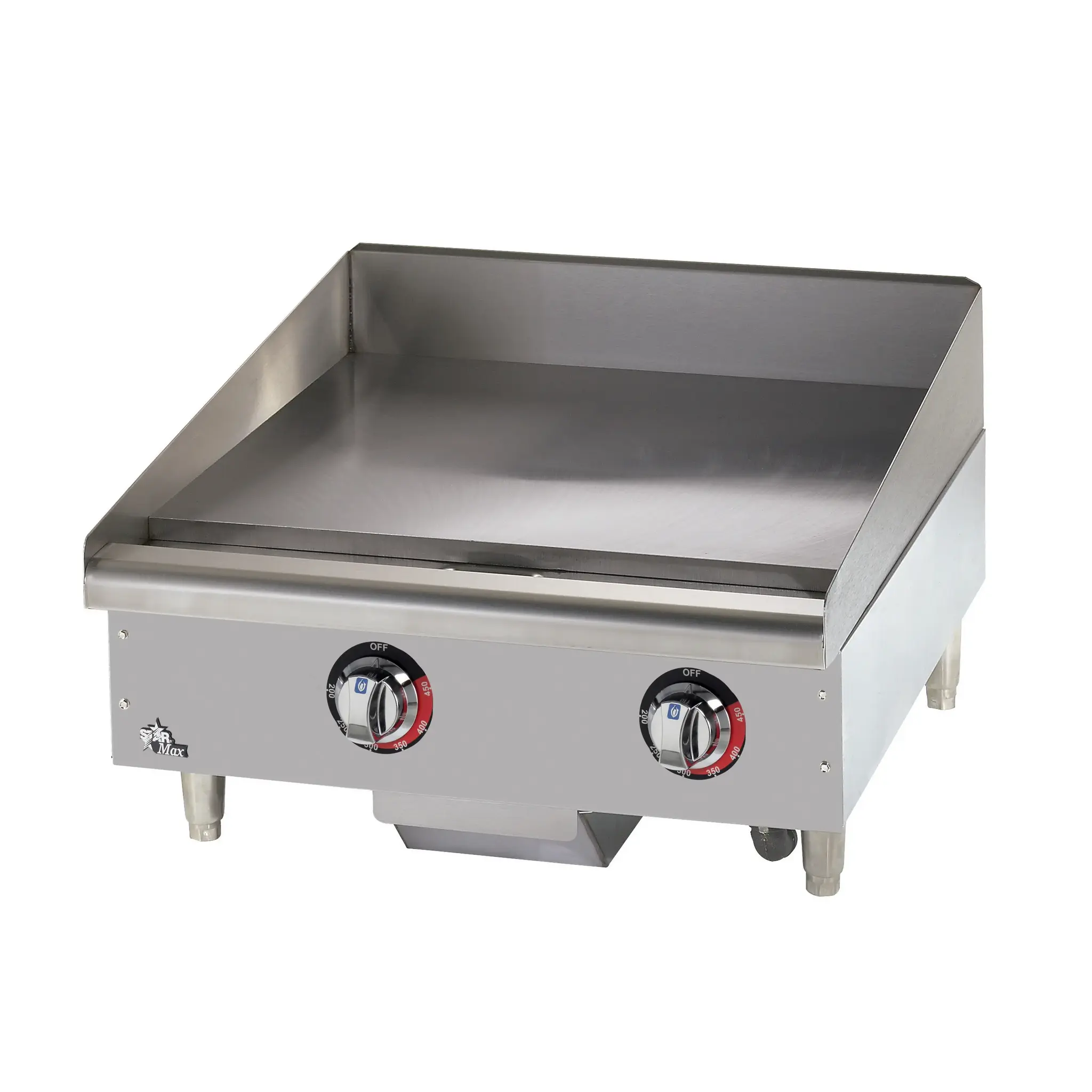 Equip your commercial kitchen with the Star, 524TGF, Electric Countertop Griddle. This heavy-duty griddle is designed to meet the demands of a busy restaurant kitchen. With a 24" wide by 20-3/4" deep cooking surface, you'll have plenty of space to cook multiple items at once. The 1" thick polished griddle plate ensures even heat distribution and excellent heat retention. The snap-action thermostat allows you to easily adjust the temperature from 150 to 450 degrees Fahrenheit, giving you precise control over your cooking. The 4000 watt element is positioned every 12 inches for consistent heat across the entire cooking surface. The welded steel frame and stainless steel top and front provide durability and easy cleaning. The griddle also features a splash guard, grease trough, and grease drawer for added convenience. With its UL and CSA certifications, you can trust the quality and safety of this Made in USA griddle. Upgrade your kitchen with the Star, 524TGF, Electric Countertop Griddle and experience efficient and reliable cooking.