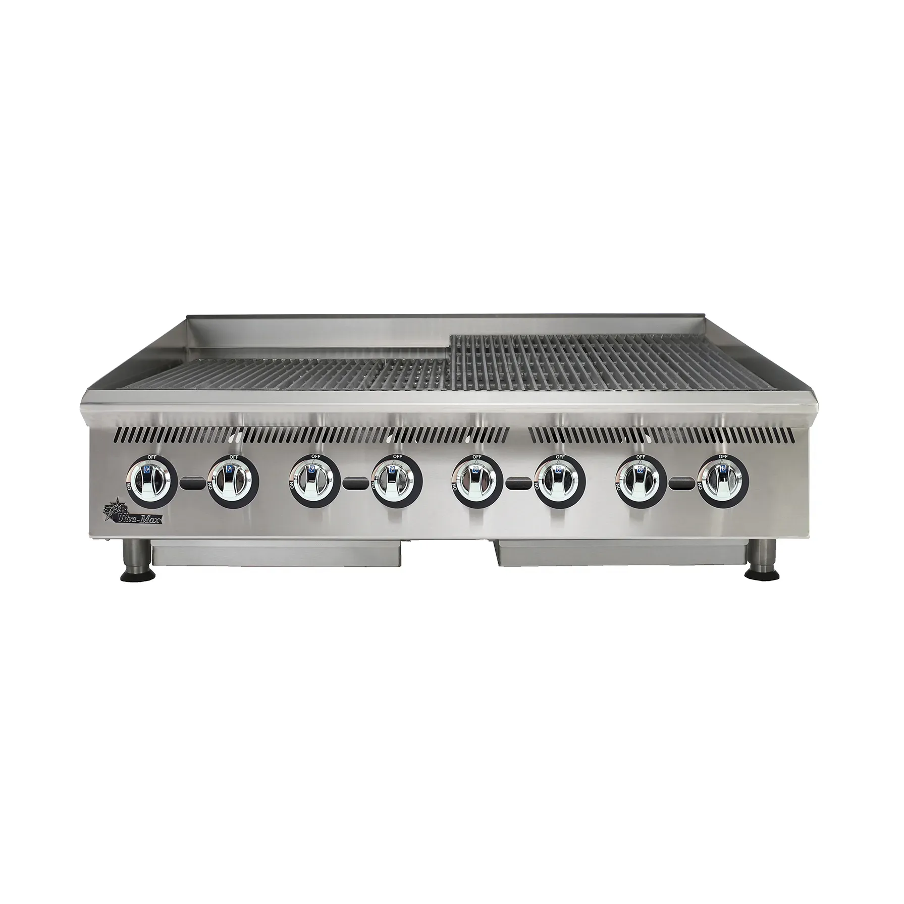 Enhance your commercial kitchen with the Star, 8048CBB, Charbroiler, Gas, Countertop. This ultra-max charbroiler is designed to meet the demands of a busy restaurant kitchen. With a length of 48 inches, a depth of 35-1/5 inches, and a height of 18 inches, this charbroiler provides ample cooking space for grilling a variety of meats and vegetables. The adjustable manual controls, located every 6 inches, allow for precise temperature control, ensuring that your food is cooked to perfection every time. The welded steel frame with a stainless steel exterior not only provides durability but also gives the charbroiler a sleek and professional look. The cast iron broiling grates, drip pan, splash guard, and grease trough make cleaning a breeze. With a BTU rating of 160,000, this charbroiler delivers powerful and consistent heat for fast and efficient cooking. Trust in the Star, 8048CBB, Charbroiler, Gas, Countertop to elevate your restaurant's grilling capabilities.