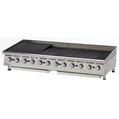 The Ultra-Max® radiant and lava rock charbroilers are constructed in the U.S.A. with a corrosion-resistant stainless steel body. The charbroilers will either use lava rocks or heavy- duty radiants to transfer heat to product. Grates are adjustable per section to be enclined or flat. The units feature cast iron burners which produce 20,000 BTUs per six 6 inches of width and have adjustable valves and a standing pilot. Units will be shipped being set up for Natural Gas, and will include field conversion kit for LP gas. Standard gas connection is 3/4-inch N.P.T. For lava rock models, a five 5 pound bag of lava rocks will be provided for each twelve 12 inches of width.