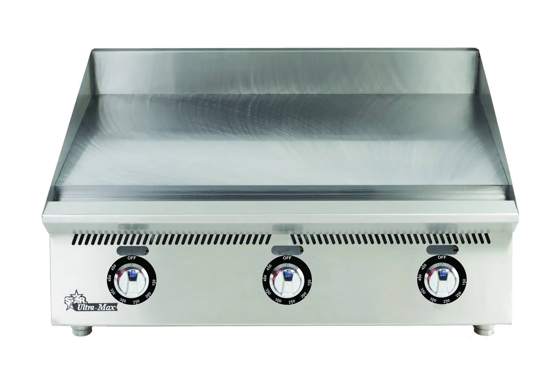 Ultra-Max® gas griddles are our highest performance griddle designed for high output and long life. For breakfast, lunch or dinner, the Ultra-Max griddles out-perform the competition. Ultra-Max® griddles features a 1” thick polished steel griddle plate, 30,000 BTU burners every 12″, and are available in 24”, 36”, 48”, 60″, and 72″ widths. Chrome plates are optional.