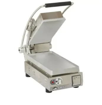 Enhance your commercial kitchen with the Star PST7-230V Panini Press. This high-quality panini press from Star is designed to meet the demands of a busy restaurant kitchen. With its 7" smooth plates, this press allows you to create delicious paninis with ease. The adjustable thermostat ensures precise temperature control, allowing you to achieve the perfect level of toasting for your sandwiches. The 230V power supply ensures efficient operation, making it ideal for commercial use. Whether you're running a small cafe or a bustling restaurant, the Star PST7-230V Panini Press is a must-have addition to your kitchen. Invest in this versatile and durable panini press to elevate your sandwich game and impress your customers.