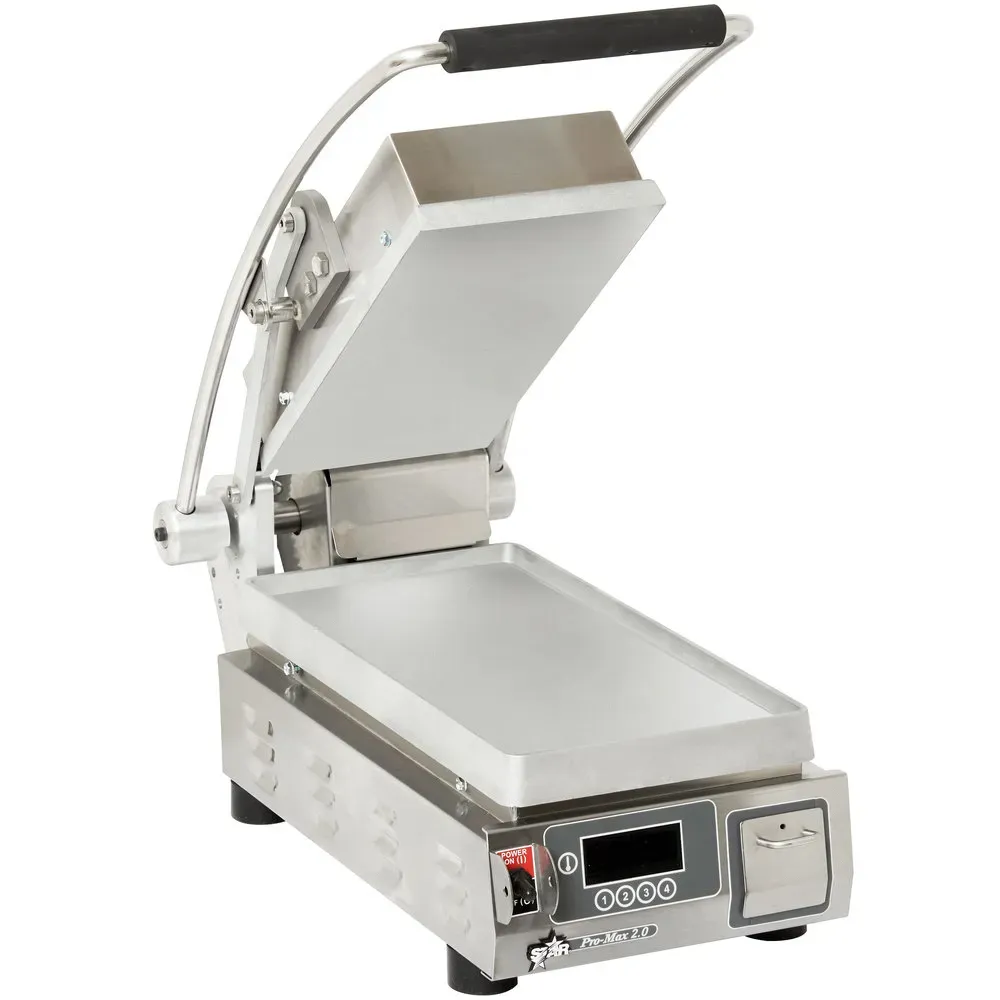Cooking at its finest with the Star PST7EA Sandwich/Panini Grill. This high-performance grill is perfect for commercial restaurant use, delivering delicious sandwiches and paninis with ease. The Pro-Max 2.0 Sandwich Grill features a 7.5" W x 14.2"D smooth aluminum cooking surface, ensuring even heat distribution for perfectly grilled sandwiches every time. The performance torsion spring hinge with an ergonomic curved handle allows for easy operation and consistent pressure on the sandwich. The electronic 175-550F thermostat controls with a timer ensure precise cooking, while the low profile design and removable grease drawer make cleaning a breeze. Made in the USA with a stainless steel exterior and non-skid feet, this grill is built to last. With its cULus and UL EPH Classified certifications, you can trust the quality and safety of this product. Upgrade your restaurant's sandwich game with the Star PST7EA Sandwich/Panini Grill.