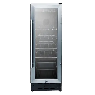 Ensure durability with the Summit Appliance SCR1225B Refrigerator Merchandiser. This beverage center is perfect for commercial restaurant use, whether built-in or freestanding. With a compact one-section design measuring 11.88"W x 22.38"D x 34.38"H, it offers a generous 2.2 cu. ft. capacity. The reversible stainless steel trimmed glass door and stainless steel handle add a touch of elegance, while the black interior and LED lighting create a sleek and inviting display. The four adjustable chrome shelves allow for flexible storage options, and the front lock ensures the security of your beverages. The automatic defrost and fan-forced cooling system maintain optimal temperature and prevent ice buildup. With its ETL-Sanitation and NSF-7 certifications, this refrigerator merchandiser guarantees food safety and hygiene. Trust Summit Appliance for reliable and efficient refrigeration solutions in your commercial restaurant.