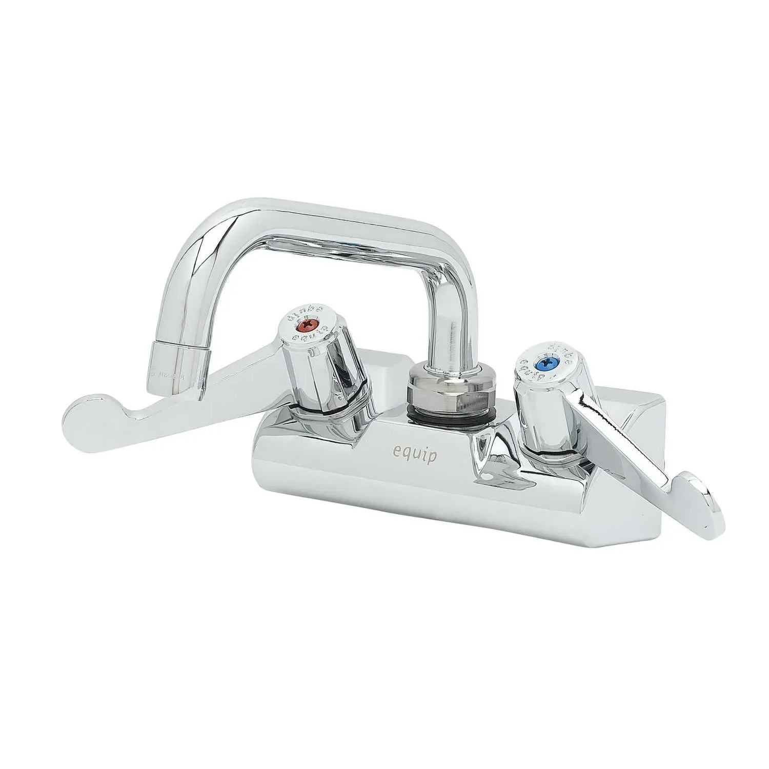 Secure System Operation with T&S Brass, 5F-4WWX06, Faucet, Wall / Splash Mount. This 4" wall mount mixing faucet is designed to deliver reliable performance in commercial restaurant settings. With its polished chrome plated brass body, it not only adds a touch of elegance to your establishment but also ensures durability and longevity. The 6" equip swing nozzle with a 2.2 GPM aerator provides a steady and controlled flow of water, making it ideal for various tasks such as filling pots and pans or rinsing dishes. The quarter-turn ceramic cartridges offer smooth and effortless operation, reducing the risk of leaks and drips. Whether you're running a busy kitchen or a bustling bar, this T&S Brass faucet is a must-have for secure and efficient system operation. Trust in its quality and enjoy the convenience it brings to your restaurant workflow.