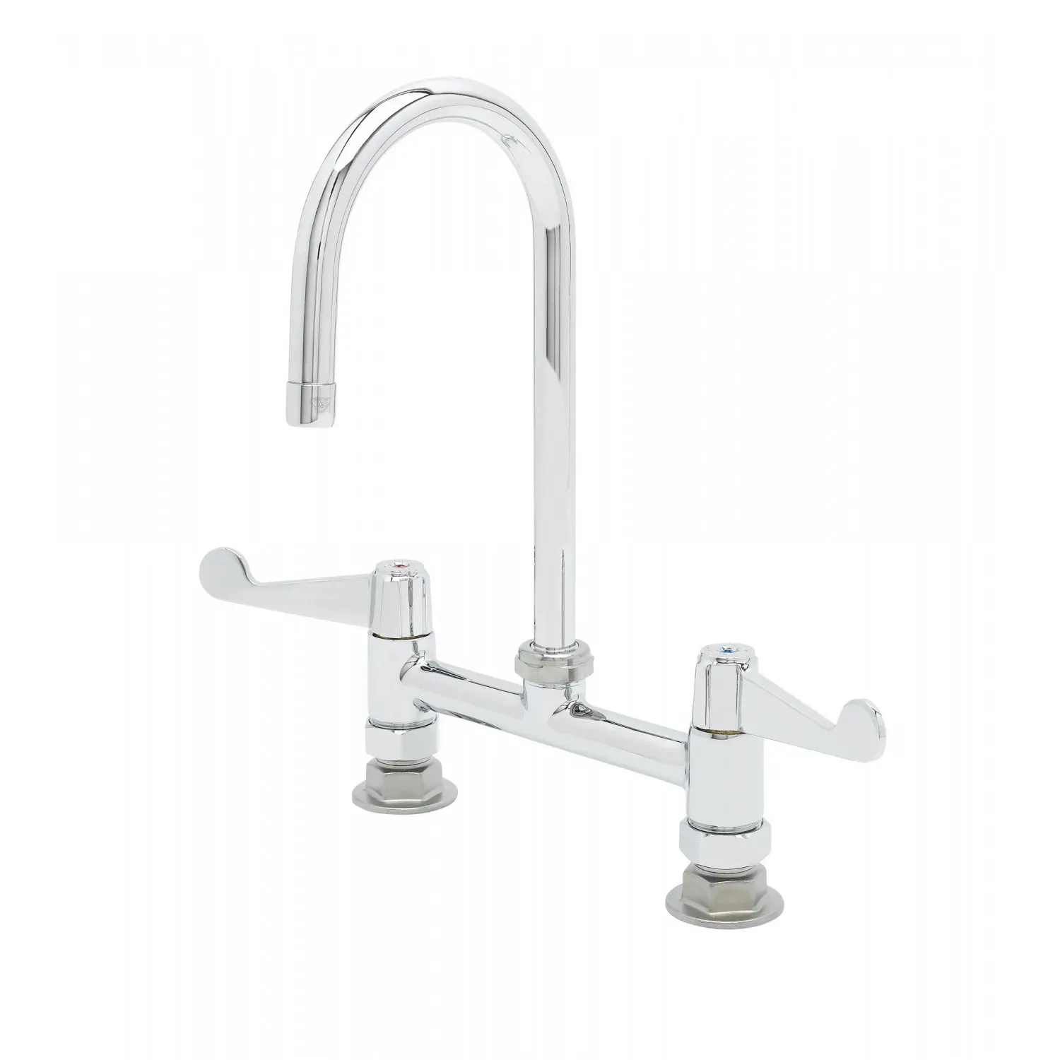 Ensure Efficient Functionality with the T&S Brass 5F-8DWS05 Deck Mount Faucet. Designed specifically for commercial restaurant use, this faucet guarantees optimal performance and durability. Its polished chrome plated brass body not only adds a sleek and professional look to your establishment but also ensures long-lasting reliability. The 8" deck mount design allows for easy installation and accessibility, while the 5 9/16" equip swivel gooseneck with a laminar full flow device provides a steady and controlled water flow. With quarter-turn ceramic cartridges, this faucet offers smooth operation and prevents leaks, saving you time and money on maintenance. Whether you're washing dishes or filling pots, the T&S Brass 5F-8DWS05 Deck Mount Faucet is the perfect choice for any commercial kitchen. Trust in its quality and efficiency to enhance the functionality of your restaurant.