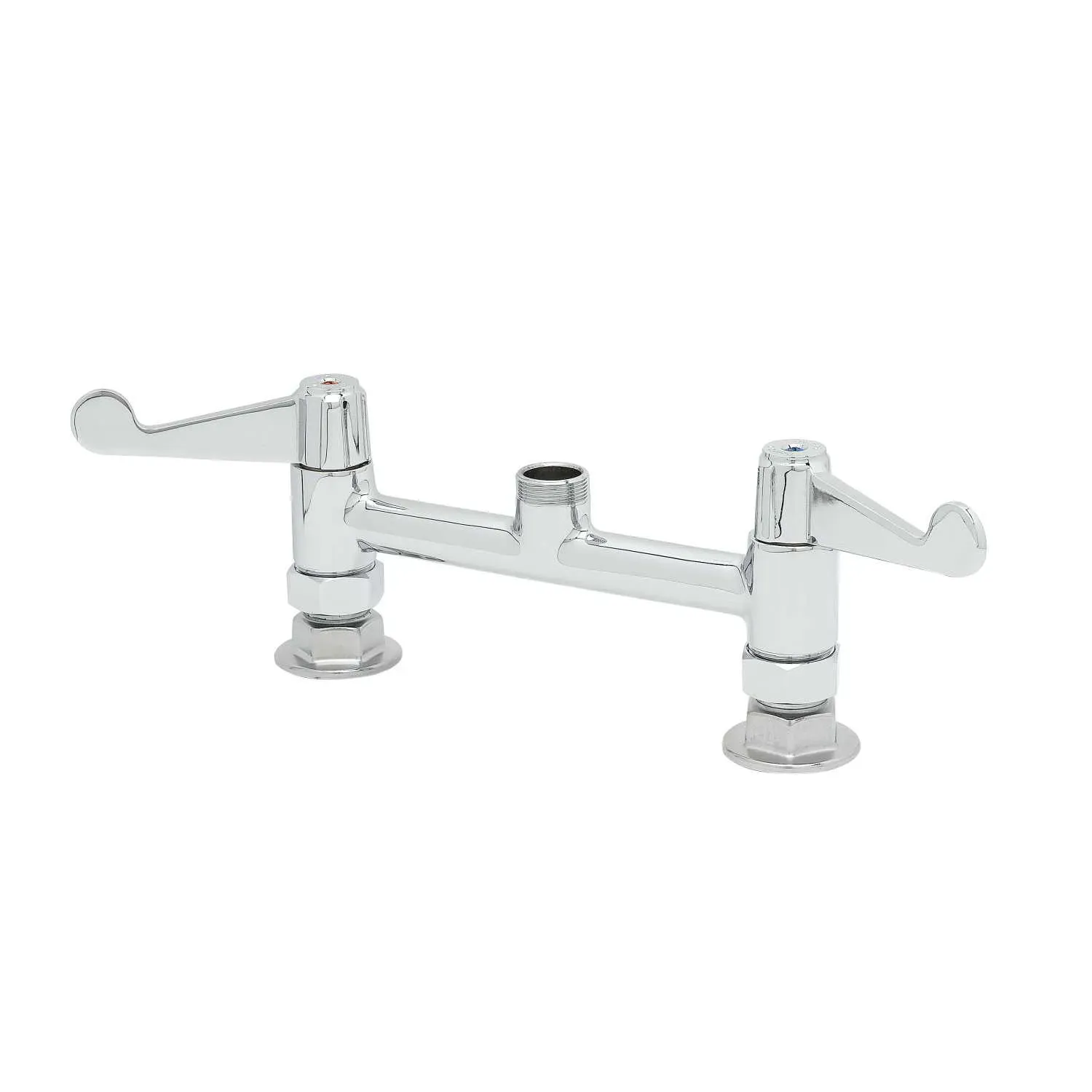 Secure Equipment Operation with T&S Brass, 5F-8DWX00, Faucet, Deck Mount. This 8" deck mount faucet is designed to ensure smooth and reliable operation in commercial restaurant settings. With its polished chrome plated brass body, it not only adds a touch of elegance to your establishment but also guarantees durability and longevity. The swivel outlet accepts equip swing nozzles, providing flexibility and convenience for various tasks in the kitchen. Thanks to the quarter-turn ceramic cartridges, you can easily control the water flow and temperature, ensuring precise adjustments and preventing any wastage. T&S Brass, a trusted name in the industry, has packed this faucet with features that prioritize functionality and ease of use. Whether you're washing dishes, filling pots, or cleaning produce, this deck mount faucet is an essential addition to any commercial kitchen, ensuring secure and efficient equipment operation.