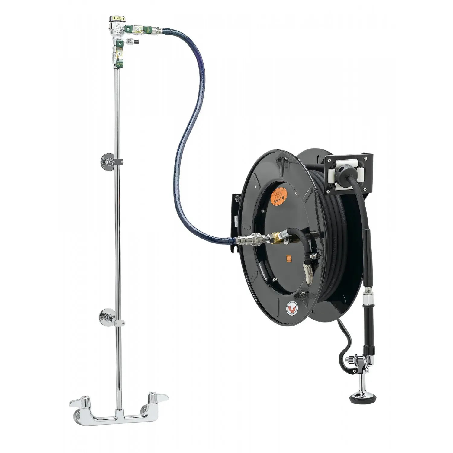 Improve Equipment Function with the T&S Brass, 5HR-242-01XE1, Hose Reel Assembly. This all-in-one system is designed to enhance the efficiency and convenience of your commercial restaurant. With its exposed piping and accessories, this hose reel assembly offers easy access and quick installation. The 8" wall mount mixing faucet, featuring a polished chrome plated brass body, adds a touch of elegance to your kitchen while ensuring durability and longevity. The quarter-turn ceramic cartridges provide smooth and precise control over water flow, reducing the risk of leaks and drips. Whether you need to clean dishes, wash produce, or fill large pots, this hose reel assembly is up to the task. Upgrade your restaurant's equipment with the T&S Brass, 5HR-242-01XE1, Hose Reel Assembly and experience improved functionality and reliability.