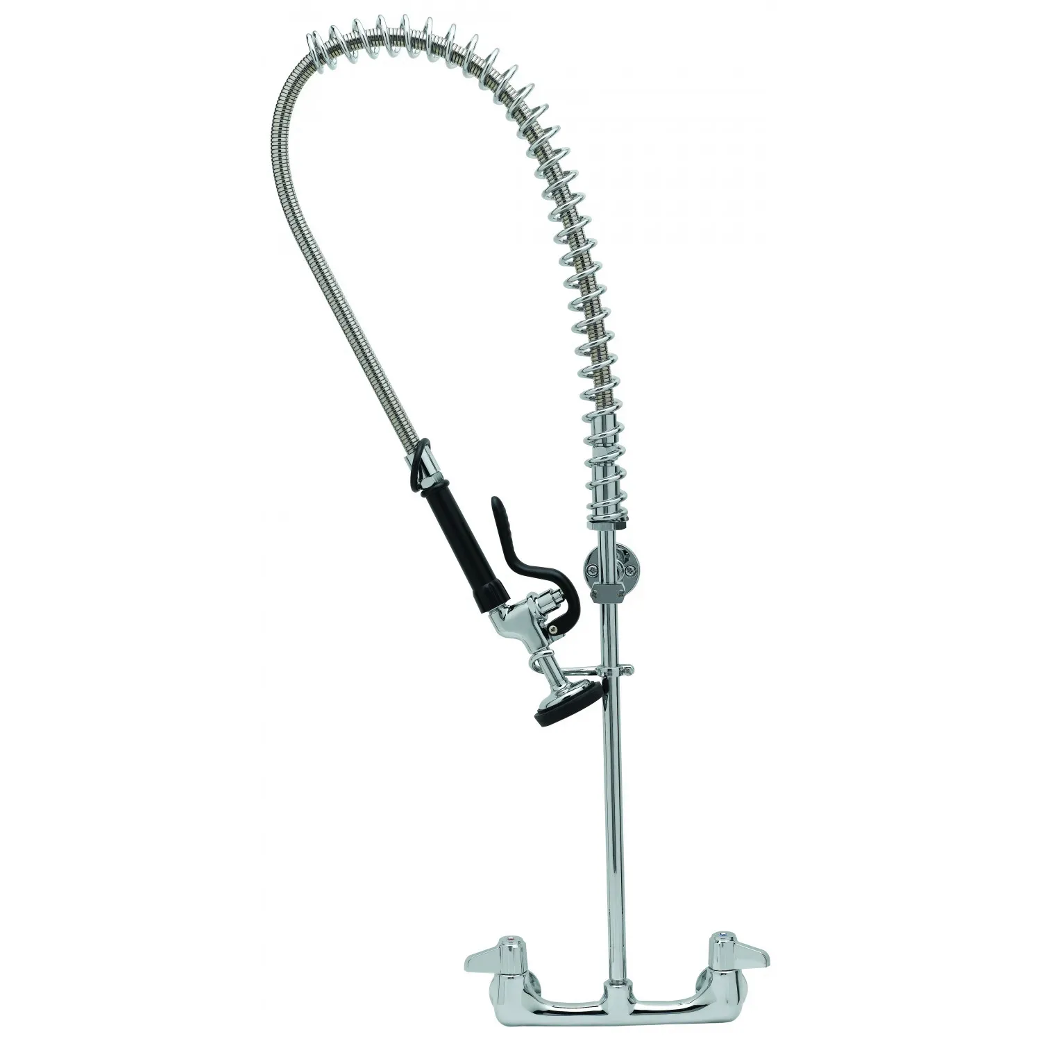 Upgrade Equipment Efficiency with the T&S Brass, 5PR-8W00, Pre-Rinse Faucet Assembly. This commercial-grade faucet assembly is designed to enhance the efficiency of your restaurant's equipment. With its 8" wall mount polished chrome plated brass body, it not only adds a sleek and professional look to your kitchen but also ensures durability and longevity. The 18" rigid riser allows for easy maneuverability, while the 44" flexible stainless steel hose with a heat-resistant black handle and hold-down ring provides convenience and flexibility during use. Whether you're rinsing dishes, cleaning countertops, or prepping ingredients, this pre-rinse faucet assembly is a reliable and efficient tool. Upgrade your restaurant's equipment with this high-quality pre-rinse faucet assembly and experience improved efficiency in your kitchen.