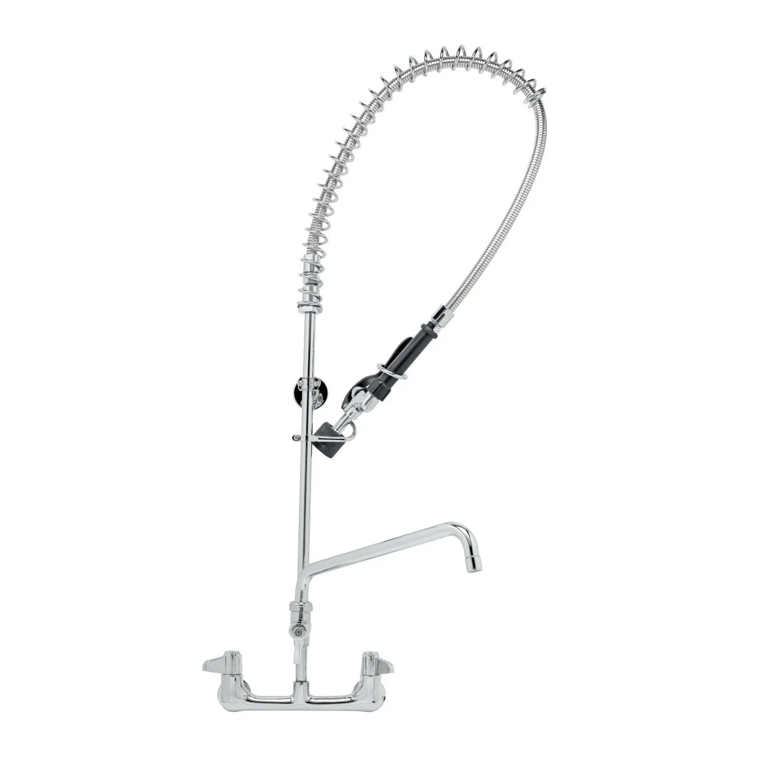Enhance Equipment Quality with the T&S Brass, 5PR-8W14-C, Pre-Rinse Faucet Assembly, with Add On Faucet. This commercial-grade faucet is designed to elevate the functionality and efficiency of your restaurant kitchen. With its polished chrome plated brass body, this faucet not only adds a touch of elegance but also ensures durability and longevity. The 8" wall mount mixing faucet and 14" swing nozzle with a laminar flow device provide precise control over water temperature and flow, making it ideal for various kitchen tasks. The add-on faucet offers additional convenience, allowing you to multitask and streamline your workflow. Whether you're rinsing dishes, filling pots, or washing produce, this pre-rinse faucet assembly delivers exceptional performance. Trust T&S Brass, a reputable vendor known for their high-quality products, to enhance the quality and efficiency of your restaurant equipment.
