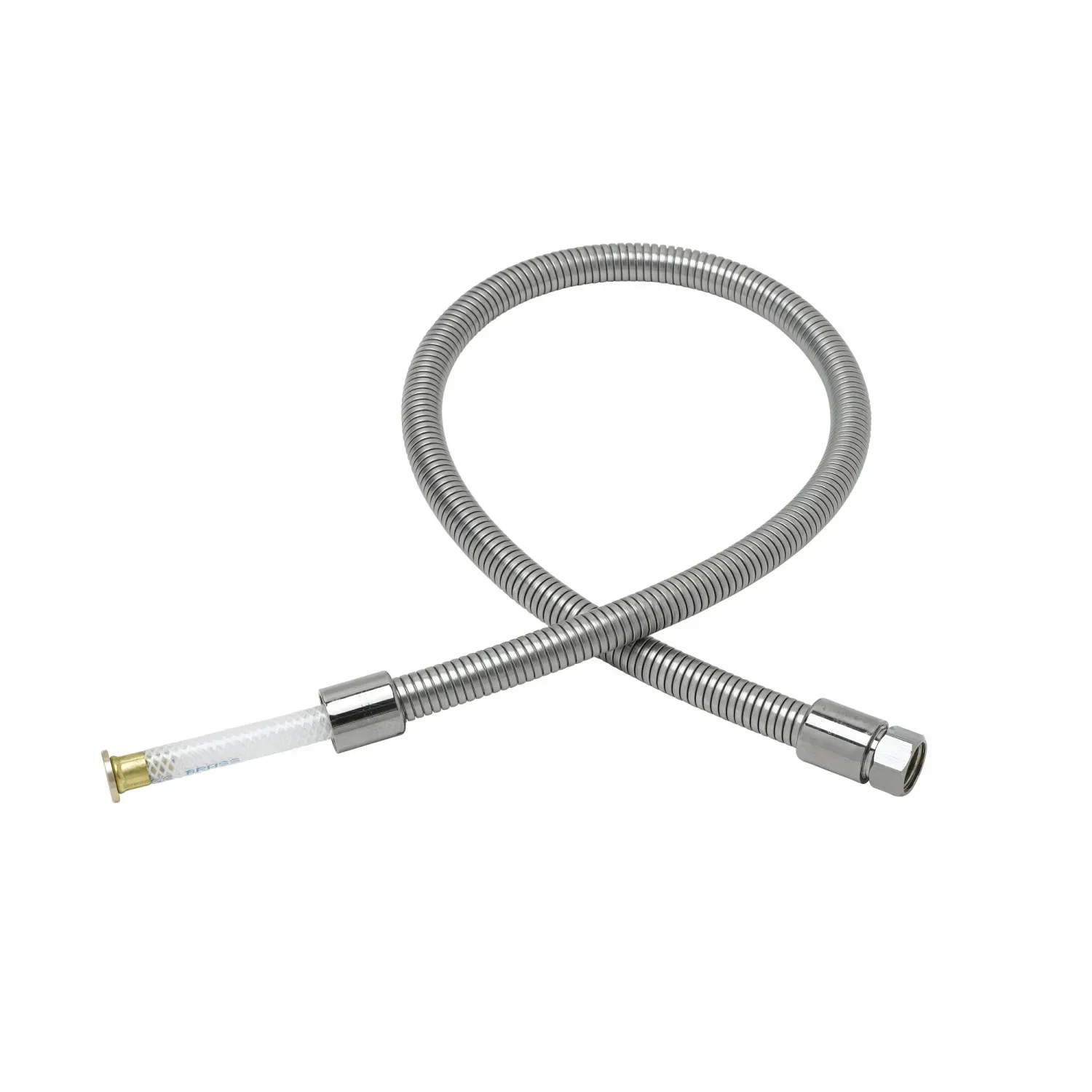 Upgrade Equipment Reliability with the T&S Brass, B-0044-H2A Pre-Rinse Flex Hose. Designed specifically for commercial restaurant use, this flexible stainless steel hose is a must-have for any busy kitchen. With a length of 38 5/8 inches and a polyurethane inner tubing, this hose provides the durability and flexibility needed to withstand the demands of a high-volume restaurant environment. The 7/8-20 UN female outlet ensures a secure connection to your pre-rinse unit, while the included handle offers comfortable and precise control. Whether you're rinsing dishes, cleaning countertops, or washing produce, this pre-rinse flex hose delivers exceptional performance and reliability. Upgrade your restaurant equipment today with the T&S Brass, B-0044-H2A Pre-Rinse Flex Hose and experience the difference in efficiency and durability.