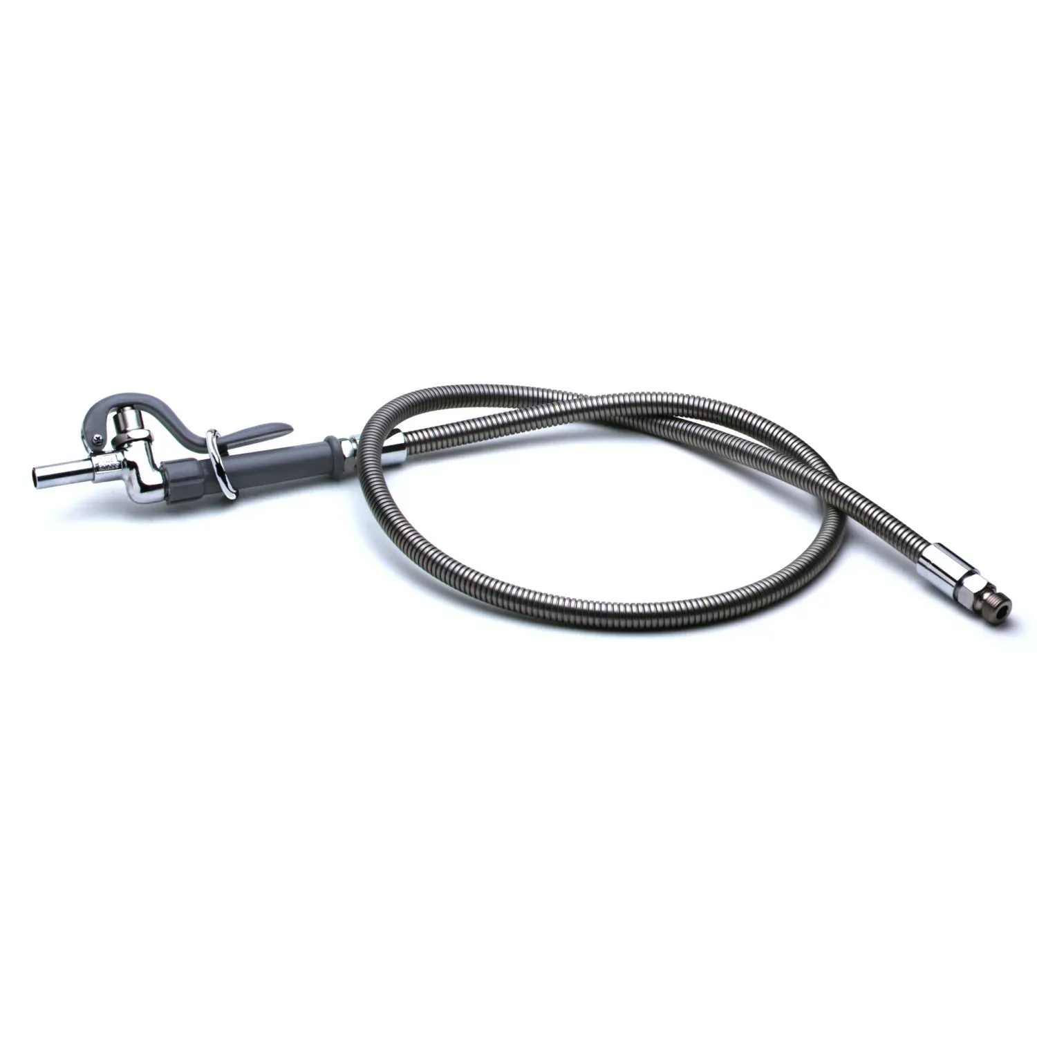 Facilitate Easy Maintenance with the T&S Brass, B-0102-B Faucet, Kettle / Pot Filler. Designed for heavy-duty use in industrial kitchens, this pot and glass filler is a reliable and efficient addition to any commercial restaurant. The self-closing spray valve with a plain end straight nozzle ensures precise control and minimal water waste. The 68" flexible stainless steel hose provides ample reach and is equipped with a heat-resistant gray handle and hold down ring for added convenience and safety. With its durable construction and high-quality materials, this pot and glass filler is built to withstand the demands of a busy kitchen environment. Whether you need to fill pots or glasses, this T&S Brass filler is up to the task. Trust in its authenticity and enjoy easy maintenance in your restaurant.