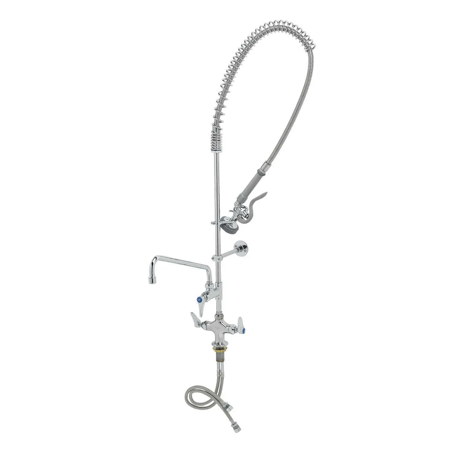 Facilitate Effective Maintenance with T&S Brass, B-0113-ADF12-B, Pre-Rinse Faucet Assembly, with Add On Faucet. This commercial-grade pre-rinse faucet assembly is designed to streamline your restaurant's dishwashing process. With its easy-install single hole base and 12" add-on faucet, this unit offers convenience and efficiency. The 18" flex lines provide flexibility and durability, ensuring long-lasting performance in a busy kitchen environment. The polished chrome plated brass body not only adds a sleek and professional look to your sink area but also guarantees durability and resistance to corrosion. The 12" swing nozzle with a stream regulator outlet allows for precise control and efficient rinsing. Whether you're washing dishes, prepping ingredients, or cleaning surfaces, this pre-rinse faucet assembly is a reliable and essential tool for any commercial restaurant. Trust T&S Brass for quality and functionality in your kitchen.