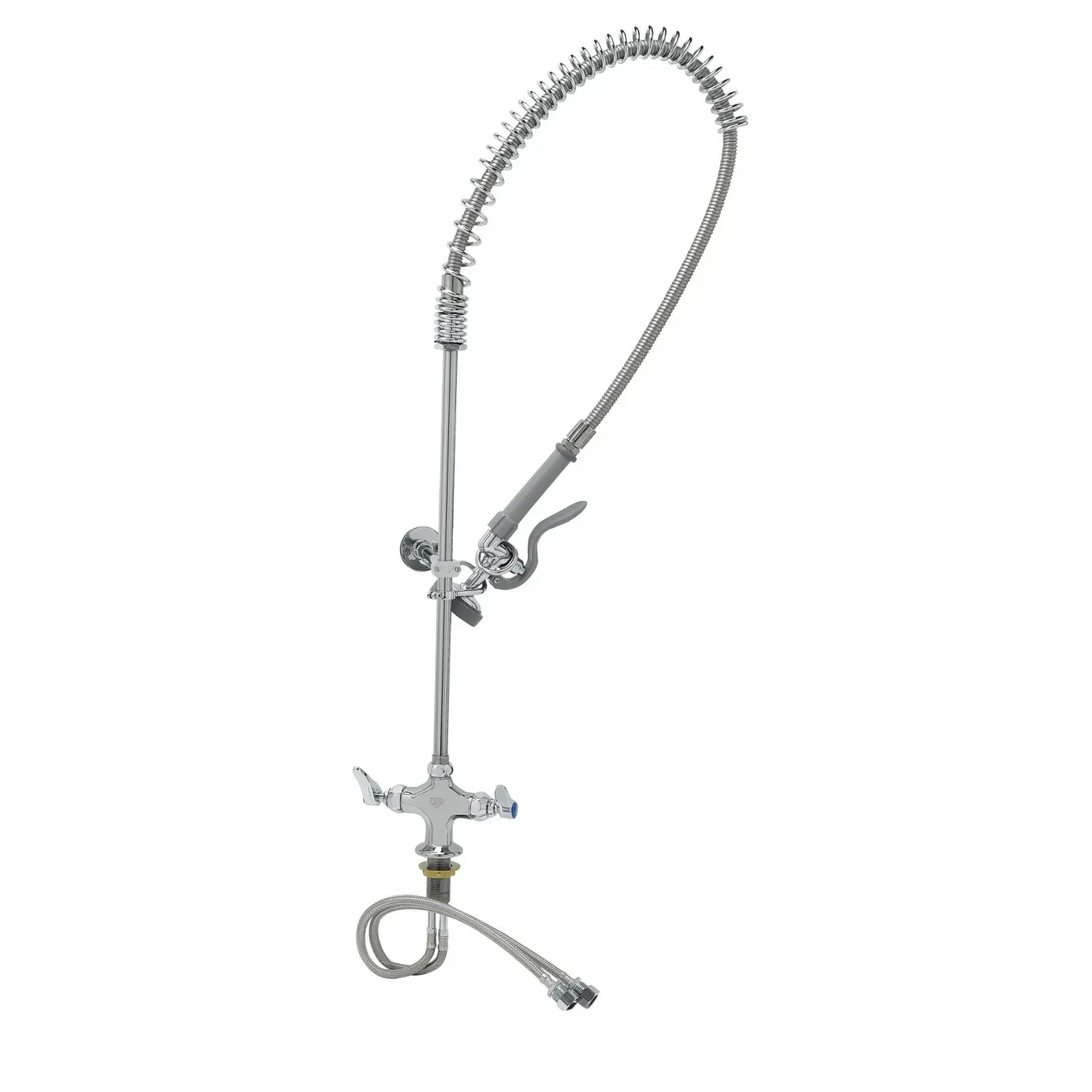 Maintain System Efficiency with the T&S Brass, B-0113-B-20R Pre-Rinse Faucet Assembly. Designed for commercial restaurant use, this easy-install pre-rinse faucet ensures optimal performance and convenience. The single hole base and flexible lines make installation a breeze, while the 20" riser provides quick and efficient operation. With a polished chrome plated brass body, this faucet assembly not only adds a touch of elegance to your kitchen but also ensures durability and longevity. The 44" flexible stainless steel hose with a heat-resistant gray handle and hold-down ring offers flexibility and ease of use, allowing for thorough cleaning of dishes and utensils. Whether you're running a bustling restaurant or a busy catering service, this pre-rinse faucet assembly from T&S Brass is a must-have for maintaining system efficiency and delivering exceptional results.