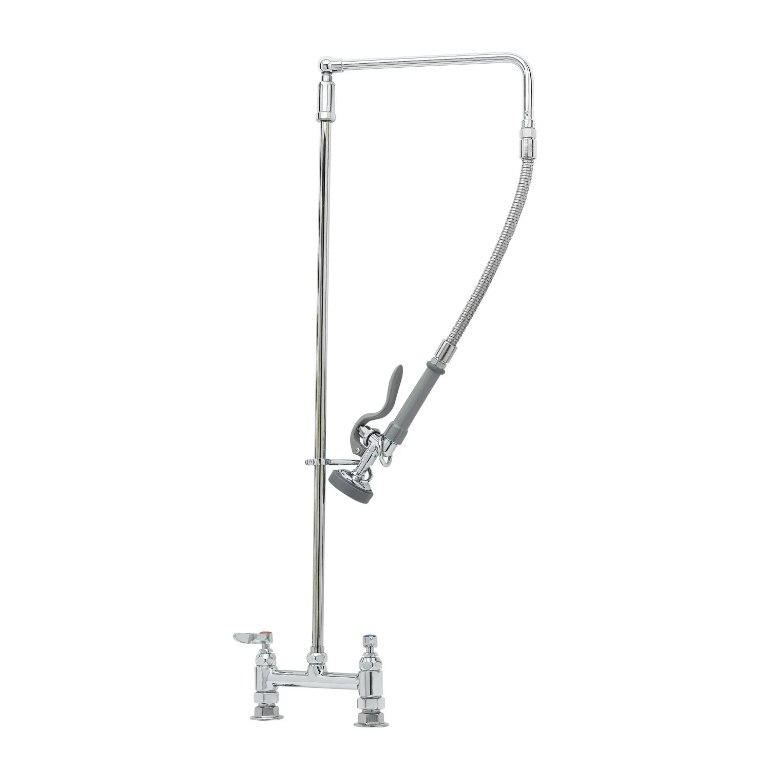 Maintain System Performance with the T&S Brass, B-0121, Pre-Rinse Faucet Assembly. This commercial-grade pre-rinse unit is designed to enhance efficiency and durability in any restaurant kitchen. With its 8" deck mount base and 12" overhead swivel arm, this faucet assembly provides flexibility and ease of use. The B-0107 spray valve ensures powerful and precise water flow, making it ideal for rinsing dishes, pots, and pans. The polished chrome plated brass body not only adds a sleek and professional look to your kitchen but also ensures long-lasting performance. The easy-install 32" riser with an overhead swivel arm allows for effortless maneuverability, making it convenient to reach all areas of the sink. Whether you're running a busy restaurant or a bustling cafe, the T&S Brass, B-0121, Pre-Rinse Faucet Assembly is the perfect choice to maintain system performance and streamline your kitchen operations.