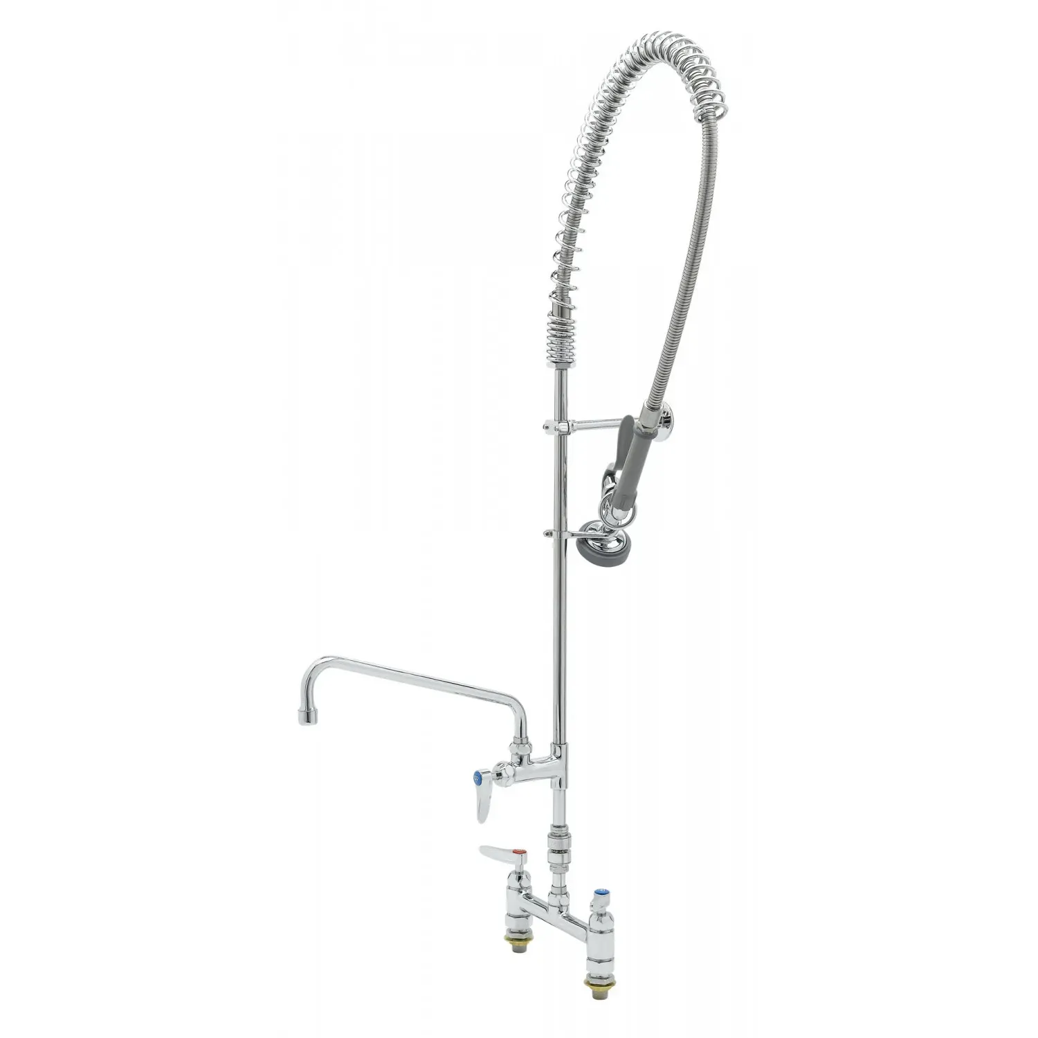 Secure System Operation with T&S Brass, B-0123-12CRCCVB, Pre-Rinse Faucet Assembly, with Add On Faucet. This commercial-grade pre-rinse faucet assembly is designed to meet the rigorous demands of a busy restaurant kitchen. With its 8" deck mount mixing faucet and add-on faucet, it offers versatility and convenience for various tasks. The polished chrome plated brass body ensures durability and easy maintenance, while the 12" swing nozzle with a stream regulator outlet provides precise control over water flow. The vacuum breaker and flex hose further enhance the functionality and safety of this assembly. Whether you need to rinse dishes, wash produce, or fill large pots, this pre-rinse faucet assembly has got you covered. Upgrade your restaurant kitchen with this secure and efficient pre-rinse faucet assembly.