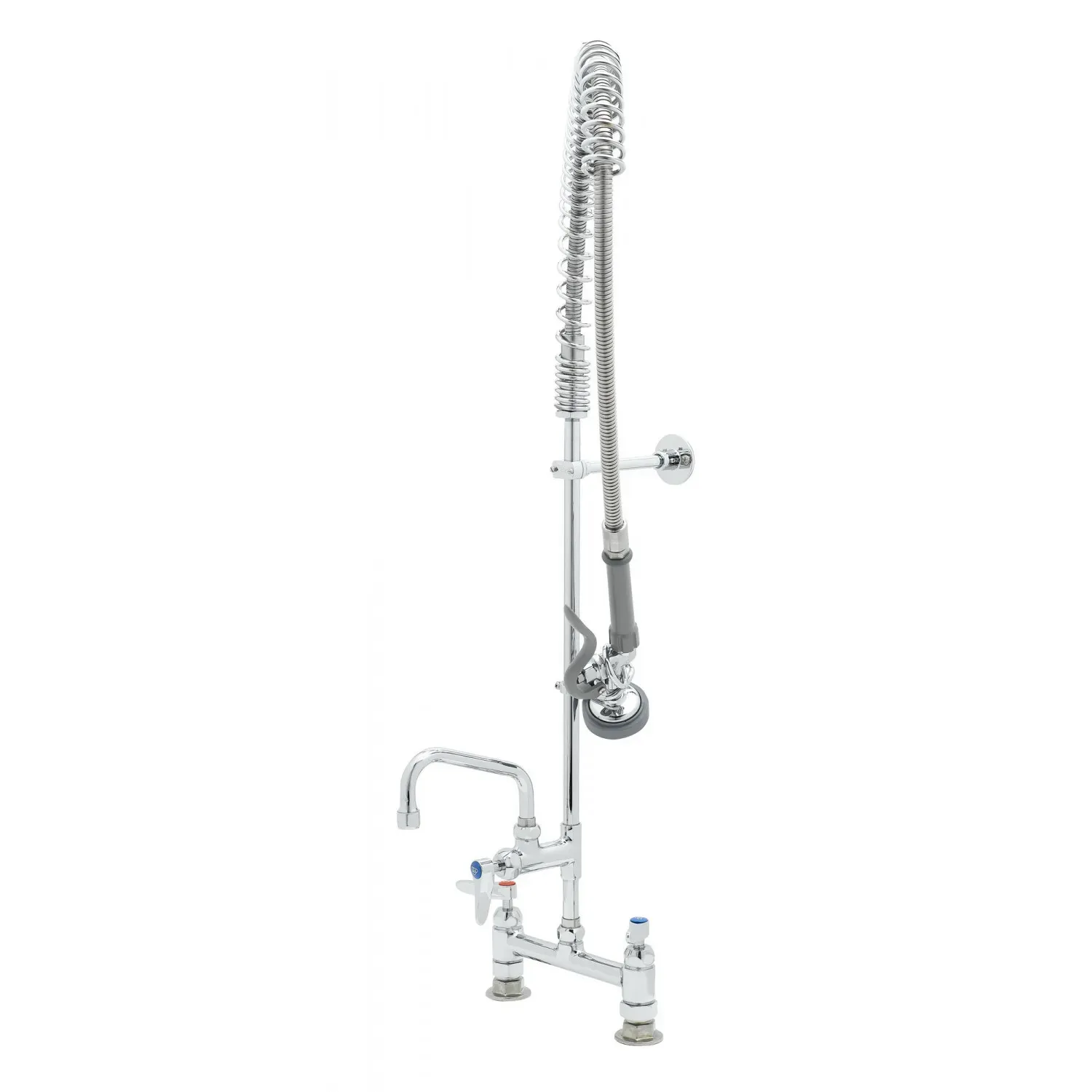 Maintain Operational Safety with T&S Brass, B-0123-ADF06-B, Pre-Rinse Faucet Assembly, with Add On Faucet. This easy-to-install deck mount base features 8" centers, ensuring stability and durability in a commercial restaurant setting. The polished chrome plated brass body of the 8" deck mount mixing faucet adds a touch of elegance while providing reliable performance. The included 6" add-on faucet offers versatility and convenience, allowing for multiple tasks to be completed simultaneously. With a swing nozzle and stream regulator outlet, this pre-rinse faucet assembly is designed to optimize water flow and efficiency. The wall bracket ensures secure installation, minimizing the risk of accidents and maintaining operational safety. Whether you're rinsing dishes, cleaning produce, or filling pots, this T&S Brass pre-rinse faucet assembly is a must-have for any commercial kitchen. Trust in the quality and reliability of T&S Brass to enhance your restaurant's efficiency and productivity.