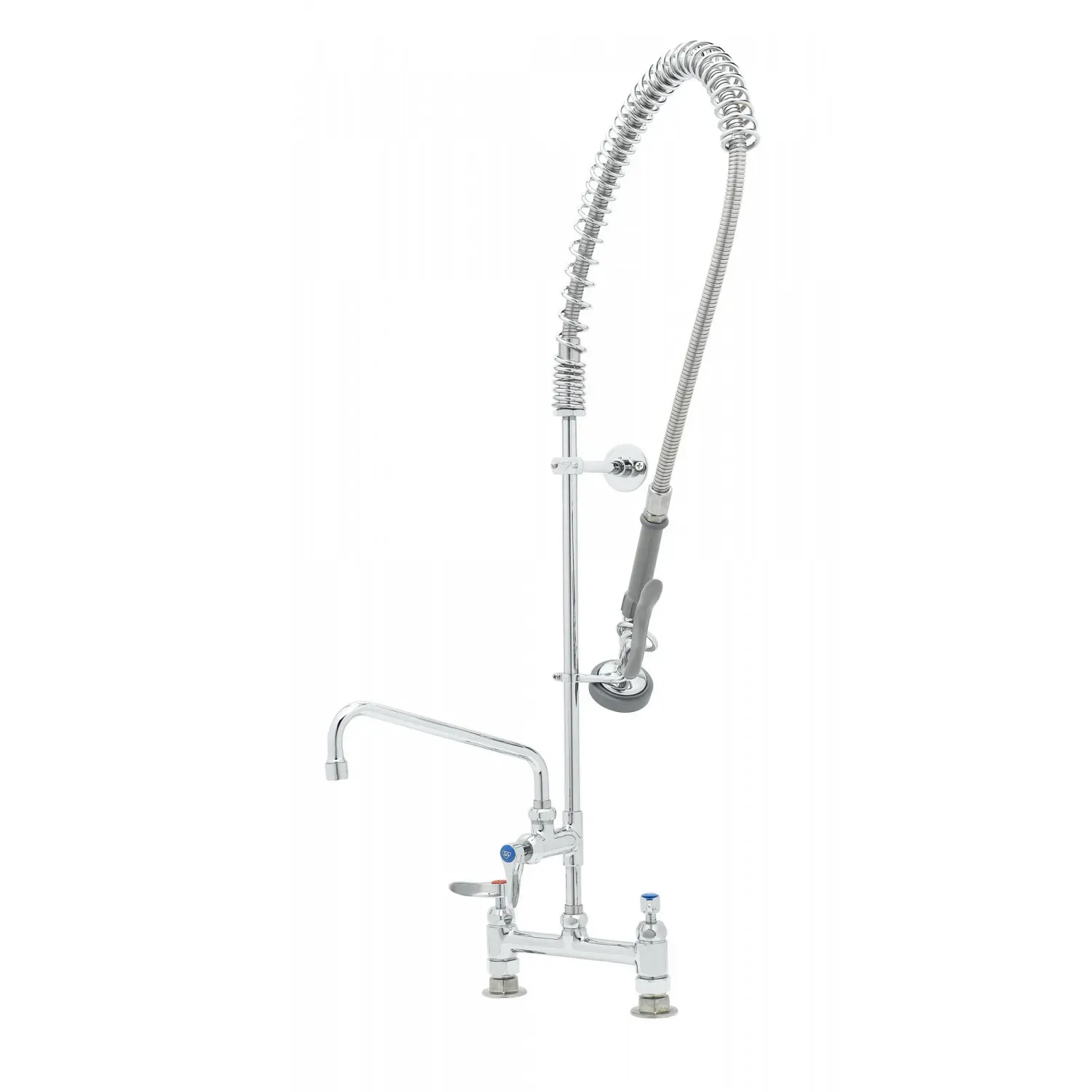 Maximize productivity levels with the T&S Brass B-0123-ADF10-B Pre-Rinse Faucet Assembly. Designed specifically for commercial restaurant use, this easy-install pre-rinse faucet assembly is a game-changer in any busy kitchen. The deck mount base with 8" centers provides stability and convenience, while the 10" add-on faucet offers versatility for various tasks. The polished chrome plated brass body ensures durability and a sleek appearance that complements any restaurant decor. With a 10" swing nozzle and stream regulator outlet, this pre-rinse faucet assembly allows for efficient cleaning and rinsing of dishes, pots, and pans. The included wall bracket adds extra support and stability, making it perfect for high-volume use. Trust T&S Brass, a reputable vendor known for their quality products, to deliver a pre-rinse faucet assembly that will enhance your restaurant's efficiency and performance. Upgrade your kitchen today with the T&S Brass B-0123-ADF10-B Pre-Rinse Faucet Assembly.