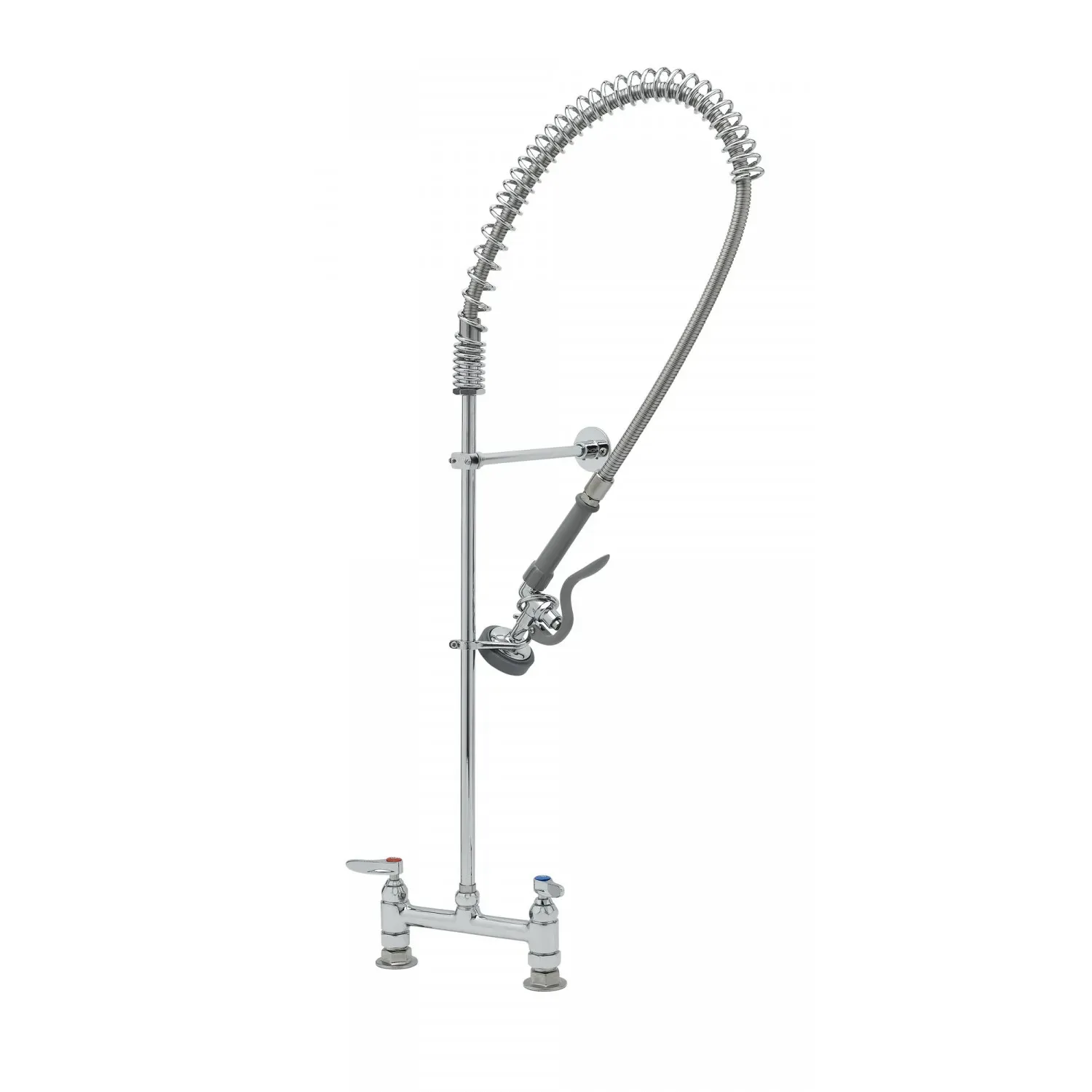 Maintain System Efficiency with the T&S Brass, B-0123-B9, Pre-Rinse Faucet Assembly. This easy-install pre-rinse faucet is designed to optimize efficiency in commercial restaurant settings. With its spring action and deck mount base, it offers convenience and flexibility. The 8" centers ensure a secure and stable installation, while the 9" wall bracket adds extra support. The polished chrome plated brass body not only enhances the faucet's durability but also adds a sleek and professional look to any kitchen. The easy-install riser allows for quick installation, saving valuable time and effort. The 44" flexible stainless steel hose with a heat-resistant gray handle and hold-down ring provides excellent maneuverability and ensures long-lasting performance. Whether you're rinsing dishes, cleaning surfaces, or prepping ingredients, this pre-rinse faucet assembly from T&S Brass is a reliable and efficient choice for any commercial restaurant.
