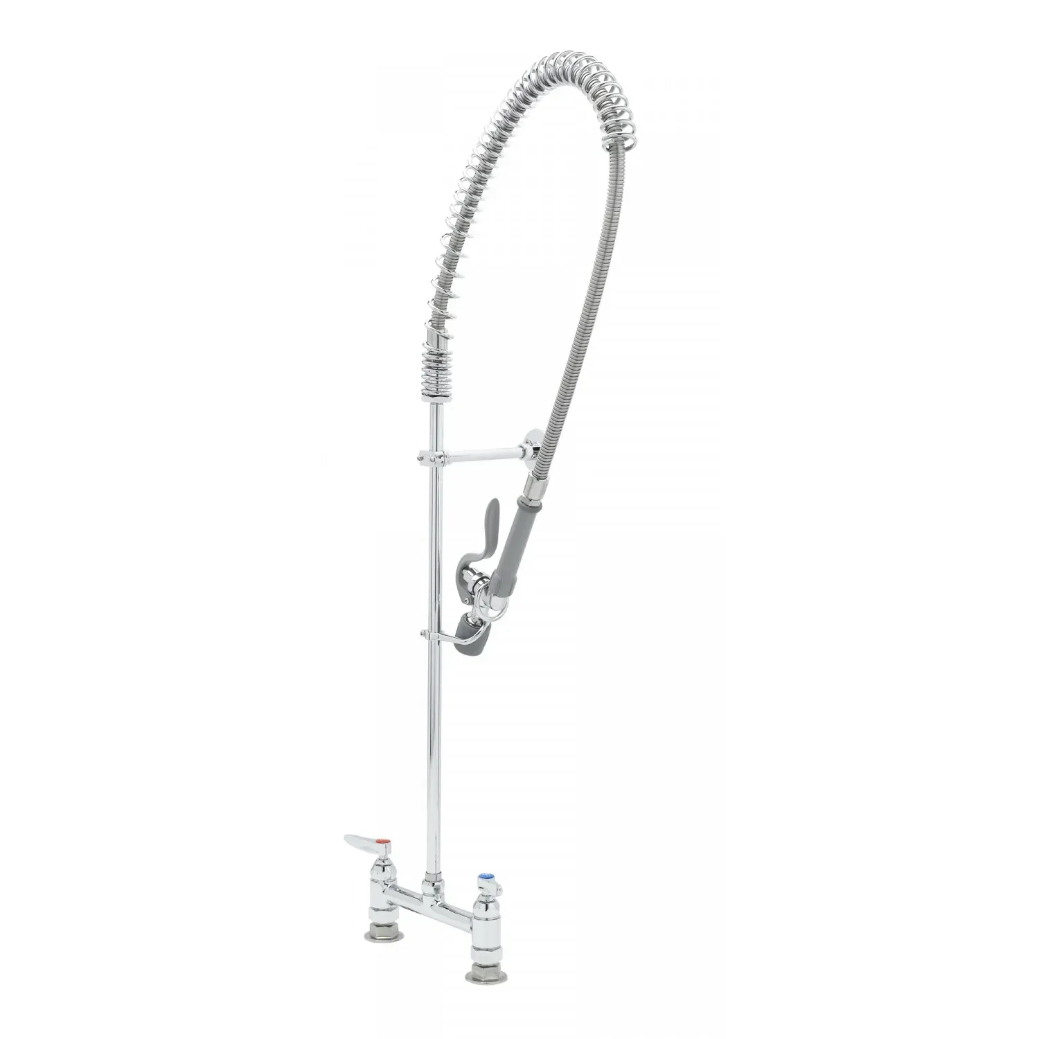Ensure System Integrity with the T&S Brass, B-0123-BC, Pre-Rinse Faucet Assembly. This commercial-grade pre-rinse unit is designed to meet the rigorous demands of a busy restaurant kitchen. With its 8" deck mount and polished chrome plated brass body, it not only provides durability but also adds a touch of elegance to your workspace. The EasyInstall riser allows for quick and hassle-free installation, ensuring minimal downtime. The low-flow spray valve helps conserve water without compromising on performance, making it an eco-friendly choice. The 44" flexible stainless steel hose with a heat-resistant gray handle and hold down ring provides maximum maneuverability and ease of use. Whether you're rinsing dishes, cleaning vegetables, or washing down countertops, this pre-rinse faucet assembly from T&S Brass is a reliable and efficient choice for any commercial restaurant.