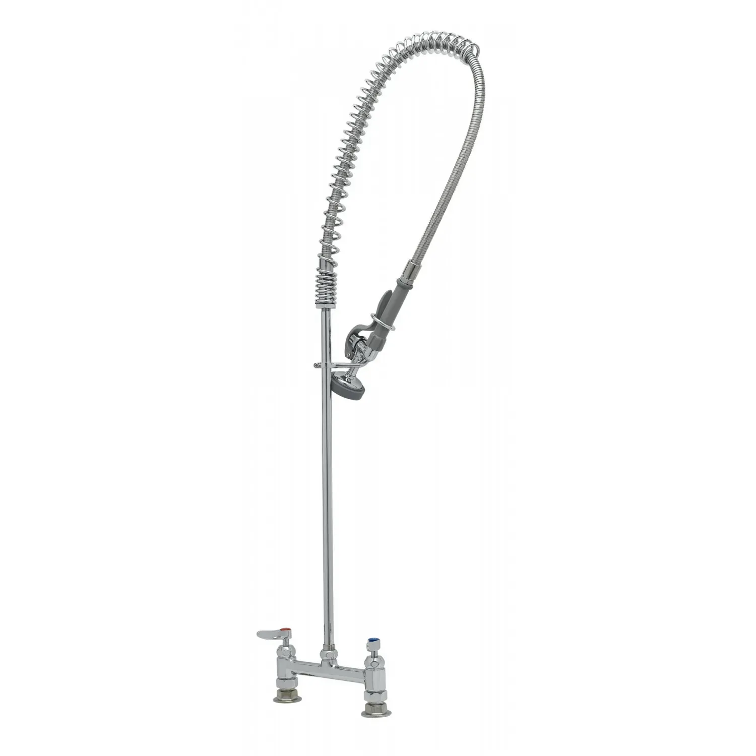 Ensure Reliable Functionality with the T&S Brass, B-0123-CR, Pre-Rinse Faucet Assembly. Designed specifically for commercial restaurant use, this pre-rinse faucet assembly guarantees efficient and hassle-free operation. The 8" deck mount polished chrome plated brass body ensures durability and longevity, even in high-volume kitchens. With the EasyInstall riser, installation is quick and straightforward, saving you time and effort. The Cerama Cartridges provide smooth and precise control over water flow and temperature, ensuring optimal performance. The 44" flexible stainless steel hose with a heat-resistant gray handle and hold down ring offers flexibility and ease of use, allowing you to reach every corner of your sink effortlessly. Whether you're rinsing dishes, cleaning vegetables, or filling pots, this pre-rinse faucet assembly is a reliable and indispensable tool in any commercial restaurant kitchen. Trust T&S Brass for top-quality, long-lasting products that meet the demands of a busy restaurant environment.
