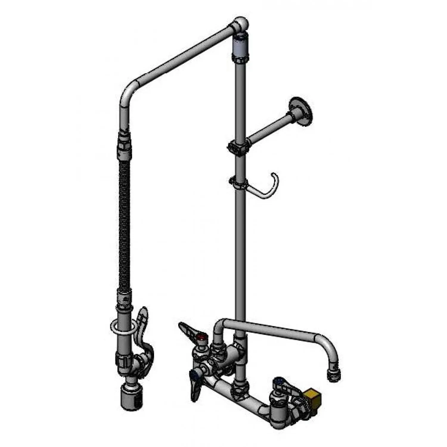 Secure System Operation with T&S Brass, B-0131-12-CRBJK, Pre-Rinse Faucet Assembly, with Add On Faucet. This high-quality pre-rinse faucet assembly is designed to meet the demanding needs of commercial restaurants. With its overhead swivel arm and 8" wall mount base, it provides flexibility and convenience in any kitchen setup. The Ceramas construction ensures durability and longevity, making it perfect for heavy-duty use. The easy-install add-on faucet with a polished chrome plated brass body adds versatility to your sink area. The 12" swing nozzle with a stream regulator outlet allows for precise control and efficient rinsing. The secure system operation ensures a reliable and consistent flow of water, making it ideal for busy restaurant kitchens. With its Series 1 designation, you can trust in the quality and performance of this pre-rinse faucet assembly. Upgrade your restaurant kitchen with T&S Brass.