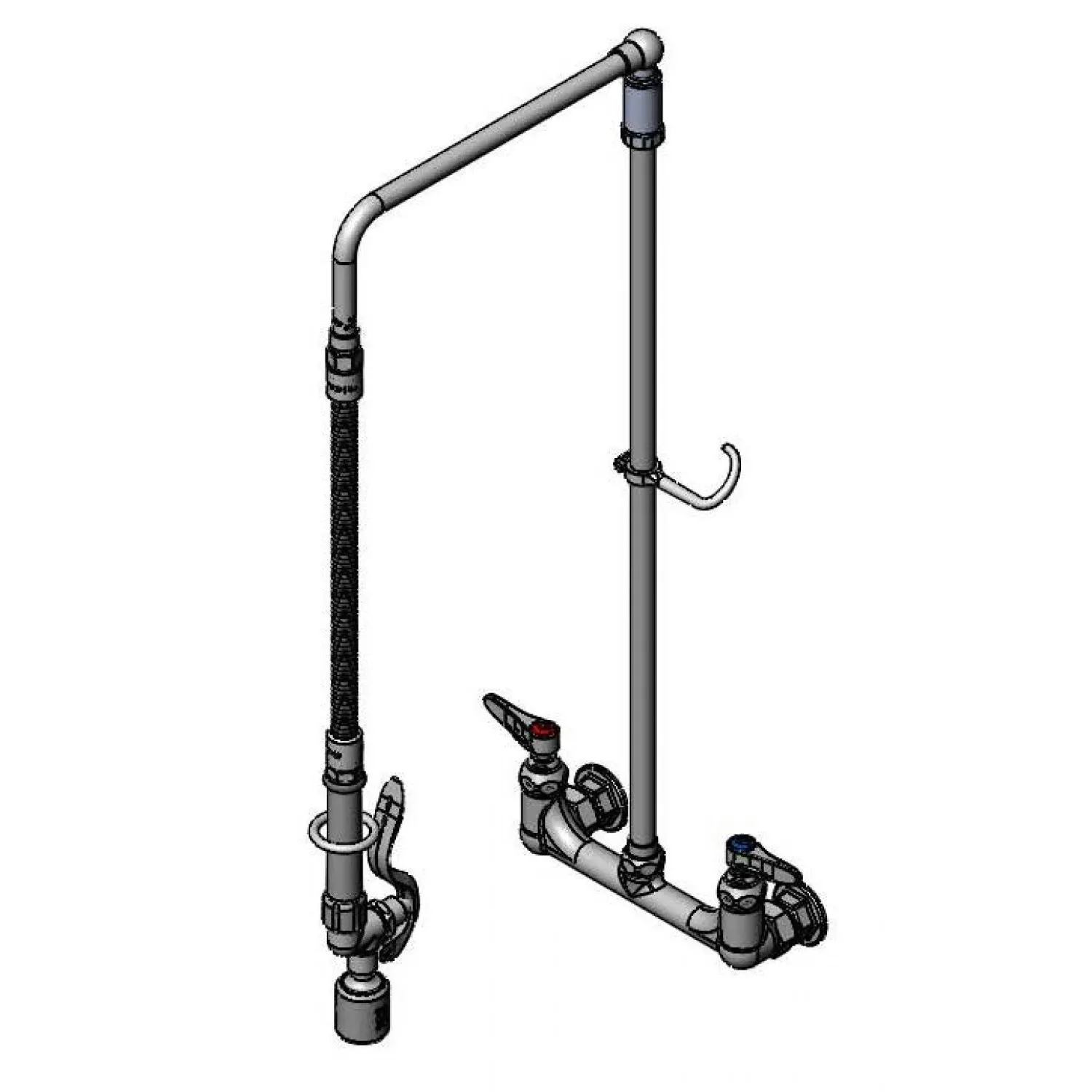 Secure Equipment Functionality with the T&S Brass, B-0131-C, Pre-Rinse Faucet Assembly. This commercial-grade pre-rinse faucet is designed to enhance efficiency and convenience in any restaurant kitchen. With its overhead swivel arm and wall mount base, it provides easy access to all areas of the sink, ensuring thorough cleaning and rinsing. The 8" centers allow for easy installation, while the low flow spray valve helps conserve water without compromising performance. The polished chrome plated brass body not only adds a sleek and professional look to your kitchen but also ensures durability and longevity. The 26" EasyInstall riser with the overhead swivel arm, along with the 20" flexible stainless steel hose, provides flexibility and ease of use. The heat resistant gray handle and hold down ring offer added safety and comfort during operation. Trust T&S Brass for reliable and efficient pre-rinse functionality in your commercial restaurant.