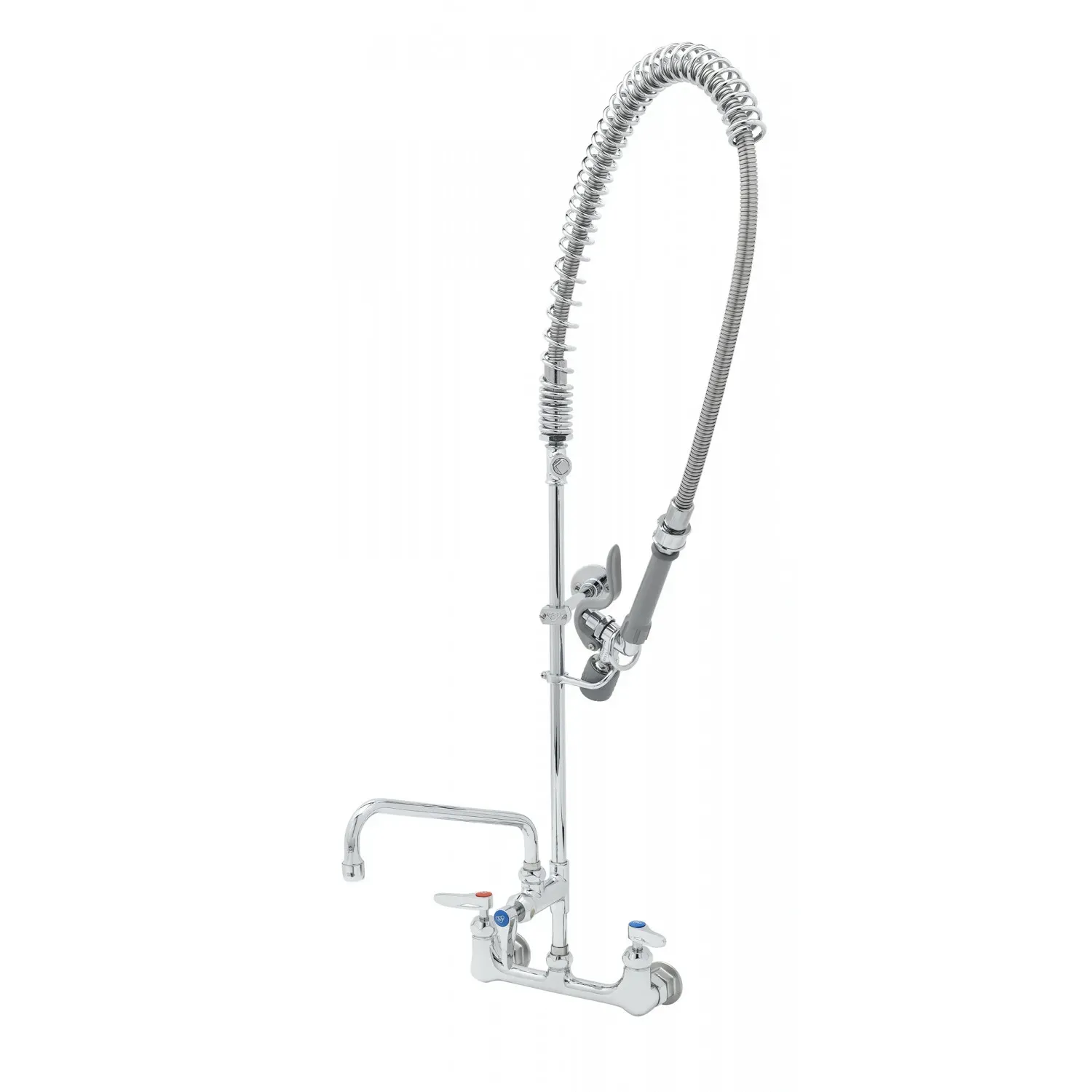 Improve system performance with the T&S Brass B-0133-10CRBJST Pre-Rinse Faucet Assembly, with Add On Faucet. This easy-install, 8" wall mount faucet is designed for commercial restaurant use, offering convenience and efficiency in one package. The faucet features Ceramas, ADF, 061X, B-0230-K, Tee, and Swivel components, ensuring durability and long-lasting performance. With a pressure range of 20 - 125 psi and a temperature range of 40°F - 140°F, this faucet can handle the demands of a busy kitchen. The spray valve has a flow rate of 1.07 GPM at 60 psi, providing a powerful and efficient rinse. Upgrade your restaurant's workflow with this high-quality and versatile faucet assembly.