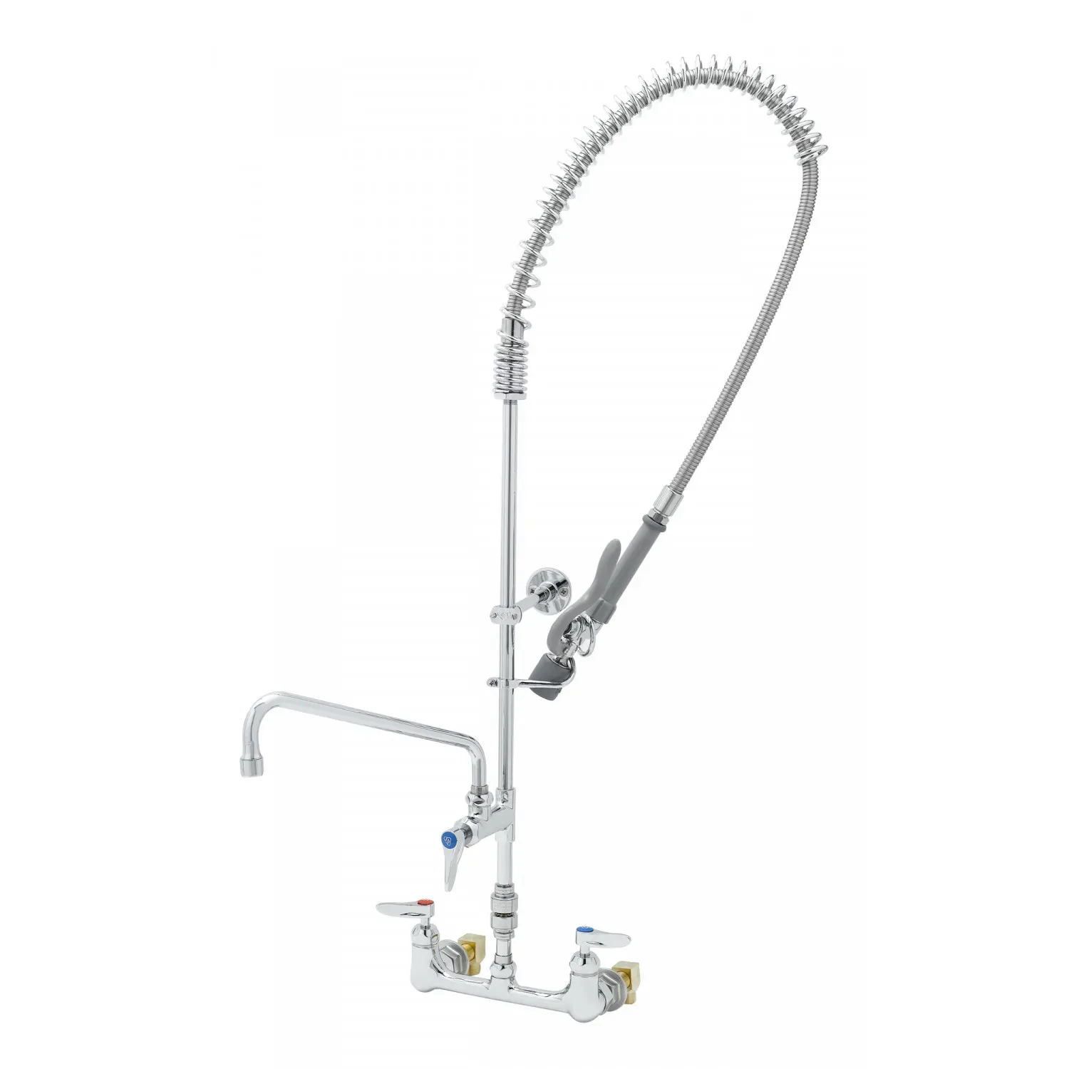 Upgrade System Quality with the T&S Brass B-0133-12CRVBCE Pre-Rinse Faucet Assembly with Add-On Faucet. This commercial-grade wall mount faucet is designed to enhance efficiency and durability in any restaurant kitchen. The 8" wall mount mixing faucet features a polished chrome plated brass body, ensuring long-lasting performance even in high-volume environments. The easy-install add-on faucet comes with a continuous pressure vacuum breaker for quick installation and added safety. With a 12" swing nozzle and stream regulator outlet, this faucet provides precise control over water flow, making it ideal for rinsing dishes and cleaning food preparation areas. Upgrade your restaurant's system with this reliable and efficient pre-rinse faucet assembly.