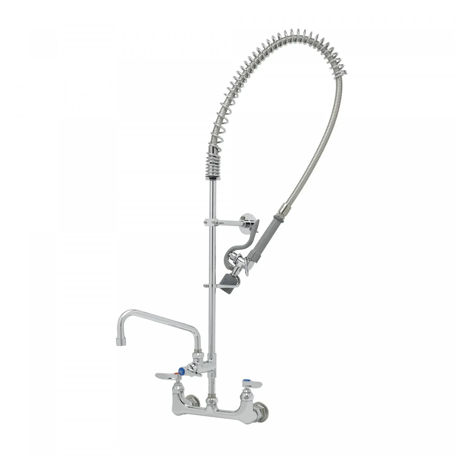 Ensure Consistent Performance with the T&S Brass B-0133-ADF08-BC Pre-Rinse Faucet Assembly. Designed specifically for commercial restaurant use, this pre-rinse unit is a reliable addition to any kitchen. The 8" wall mount and 8" swing nozzle provide flexibility and convenience, allowing for easy cleaning of dishes and utensils. The add-on faucet offers even more functionality, making it perfect for multitasking in a busy restaurant environment. With a pressure range of 20 - 125 psi and a temperature range of 40°F - 140°F, this pre-rinse unit can handle the demands of a commercial kitchen. The spray valve has a flow rate of 0.65 GPM at 60 psi, ensuring efficient water usage. Packaged by T&S Brass, this pre-rinse faucet assembly is a durable and long-lasting choice for any restaurant.