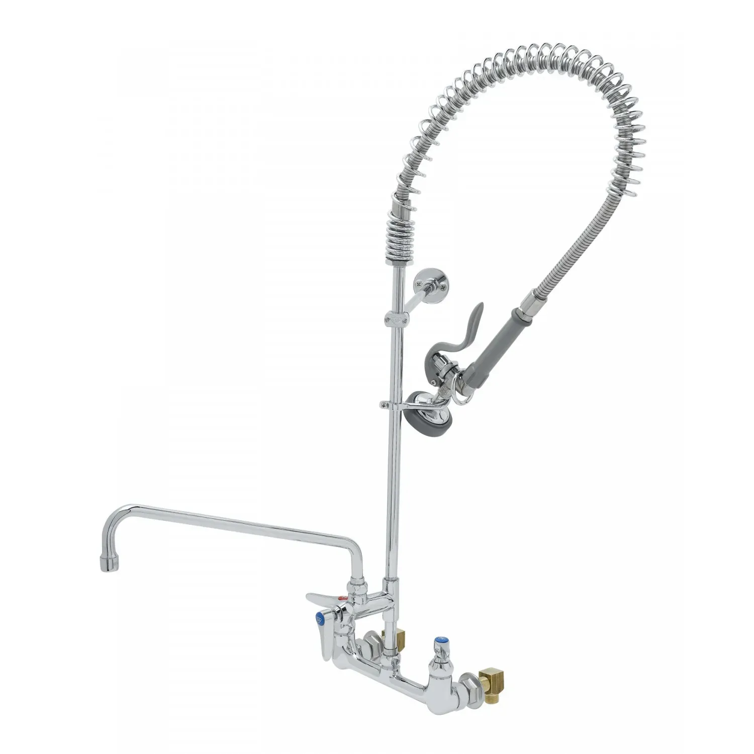 Upgrade Equipment Efficiency with the T&S Brass, B-0133-ADF14-BR Pre-Rinse Faucet Assembly. Designed specifically for commercial restaurant use, this 8" wall mount pre-rinse faucet offers exceptional performance and durability. The polished chrome plated brass body ensures long-lasting reliability, even in high-volume kitchens. With supply stops, hoses, and elbows included, installation is quick and hassle-free. The 14" swing nozzle with a stream regulator outlet provides flexibility and precision, allowing for efficient rinsing of dishes and utensils. The easy-install add-on faucet further enhances functionality, making it convenient to fill pots and pans or wash hands. This pre-rinse faucet assembly is part of Series 1, guaranteeing compatibility and easy integration with existing equipment. Trust T&S Brass, a reputable vendor known for their quality products, to elevate your restaurant's efficiency and productivity.