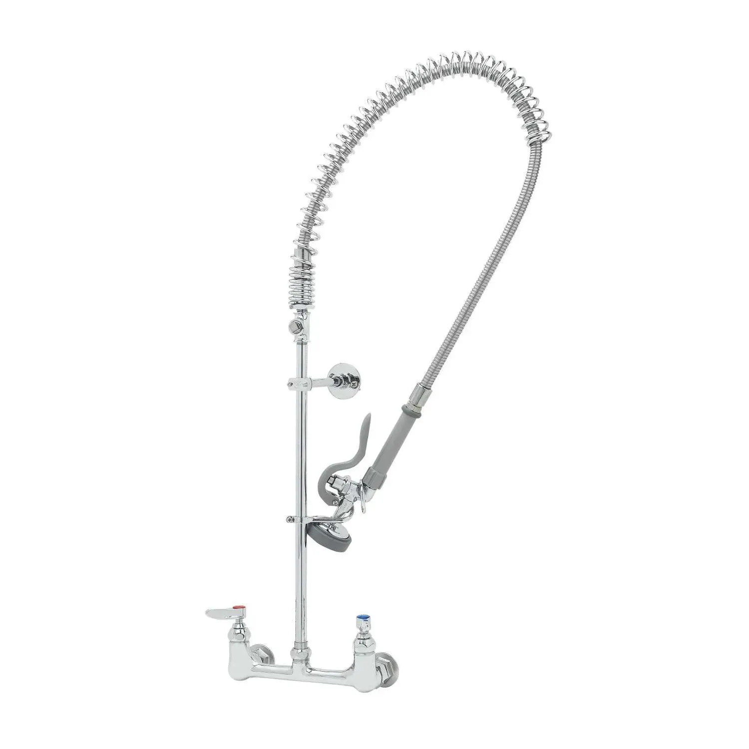 Upgrade System Performance with the T&S Brass, B-0133-B-TEE, Pre-Rinse Faucet Assembly. This easy-install pre-rinse faucet assembly is designed to enhance efficiency and productivity in commercial restaurant settings. With its 8" wall mount mixing faucet featuring a polished chrome plated brass body, this assembly ensures durability and a sleek appearance. The EasyInstall 18" riser allows for quick installation, saving valuable time in busy kitchens. The 44" flexible stainless steel hose with a heat-resistant gray handle and hold down ring provides flexibility and ease of use, allowing for efficient rinsing and cleaning. Whether you're washing dishes, prepping ingredients, or cleaning surfaces, this pre-rinse faucet assembly from T&S Brass is a reliable and essential tool. Trust in its quality and performance to optimize your restaurant's workflow and maintain impeccable hygiene standards.