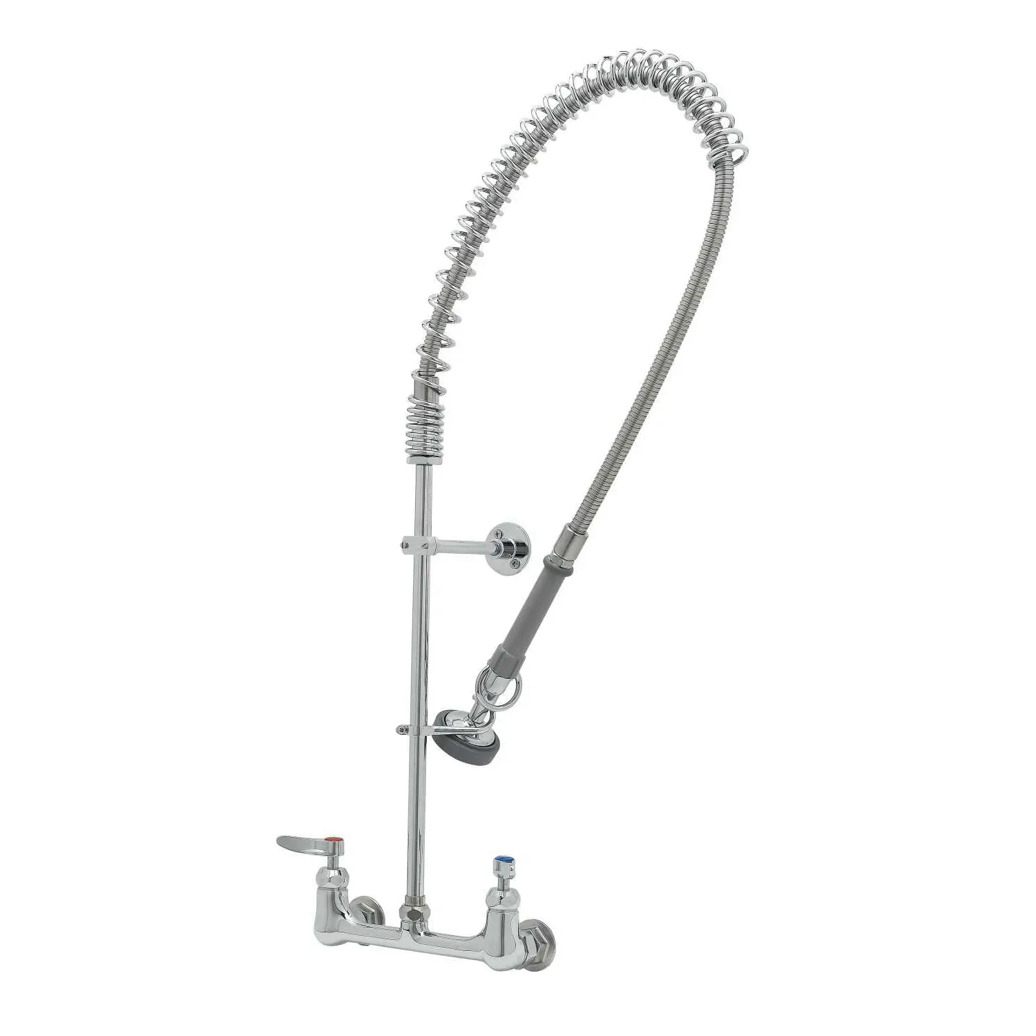 Secure Equipment Operation with the T&S Brass B-0133-CCB-CR Pre-Rinse Faucet Assembly. Designed for commercial restaurant use, this easy-to-install pre-rinse faucet ensures efficient and reliable performance. The 8" wall mount base and polished chrome plated brass body provide durability and a sleek appearance. The EasyInstall riser allows for quick installation, saving valuable time in busy kitchen environments. With 00CC inlets and a ceramas coating, this faucet assembly is resistant to corrosion and wear, ensuring long-lasting use. The 44" flexible stainless steel hose features a heat-resistant gray handle and hold down ring, providing ease of use and maneuverability. Whether you're rinsing dishes, cleaning produce, or washing utensils, this pre-rinse faucet assembly from T&S Brass is a reliable and essential tool for any commercial restaurant. Trust in its quality and performance to keep your kitchen running smoothly.