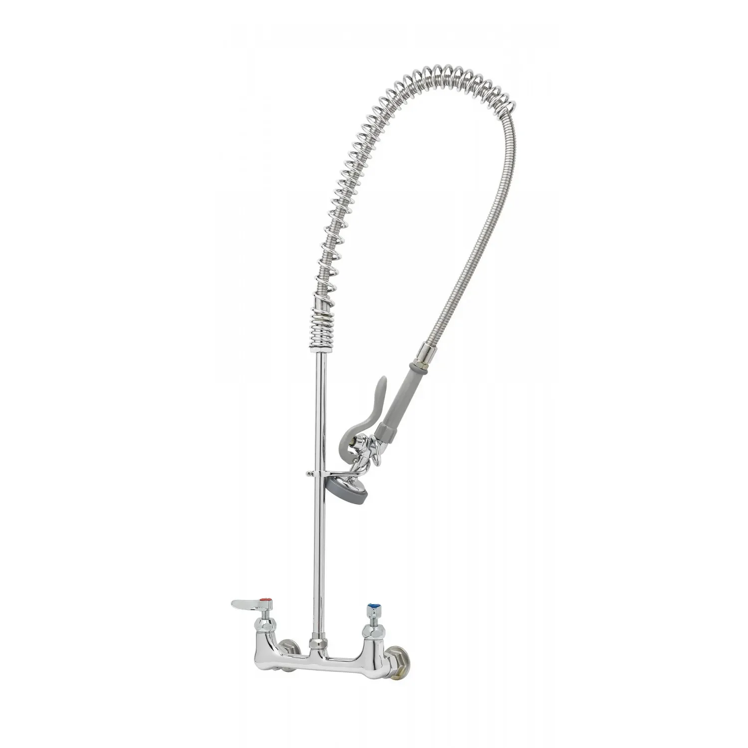 Optimize Equipment Performance with the T&S Brass, B-0133-CR, Pre-Rinse Faucet Assembly. This easy-install pre-rinse faucet is designed specifically for commercial restaurant use, ensuring efficient and effective cleaning. The wall mount base with 8" centers provides stability and convenience, while the cerama cartridges offer long-lasting durability. With a polished chrome plated brass body, this faucet not only looks sleek but also withstands the demands of a busy kitchen. The easy-install 18" riser allows for quick installation, saving you time and effort. The 44" flexible stainless steel hose with a heat-resistant gray handle and hold down ring provides flexibility and ease of use. Whether you're rinsing dishes, cleaning countertops, or washing produce, this pre-rinse faucet assembly is a reliable and essential tool for any commercial restaurant. Trust T&S Brass for quality and performance.