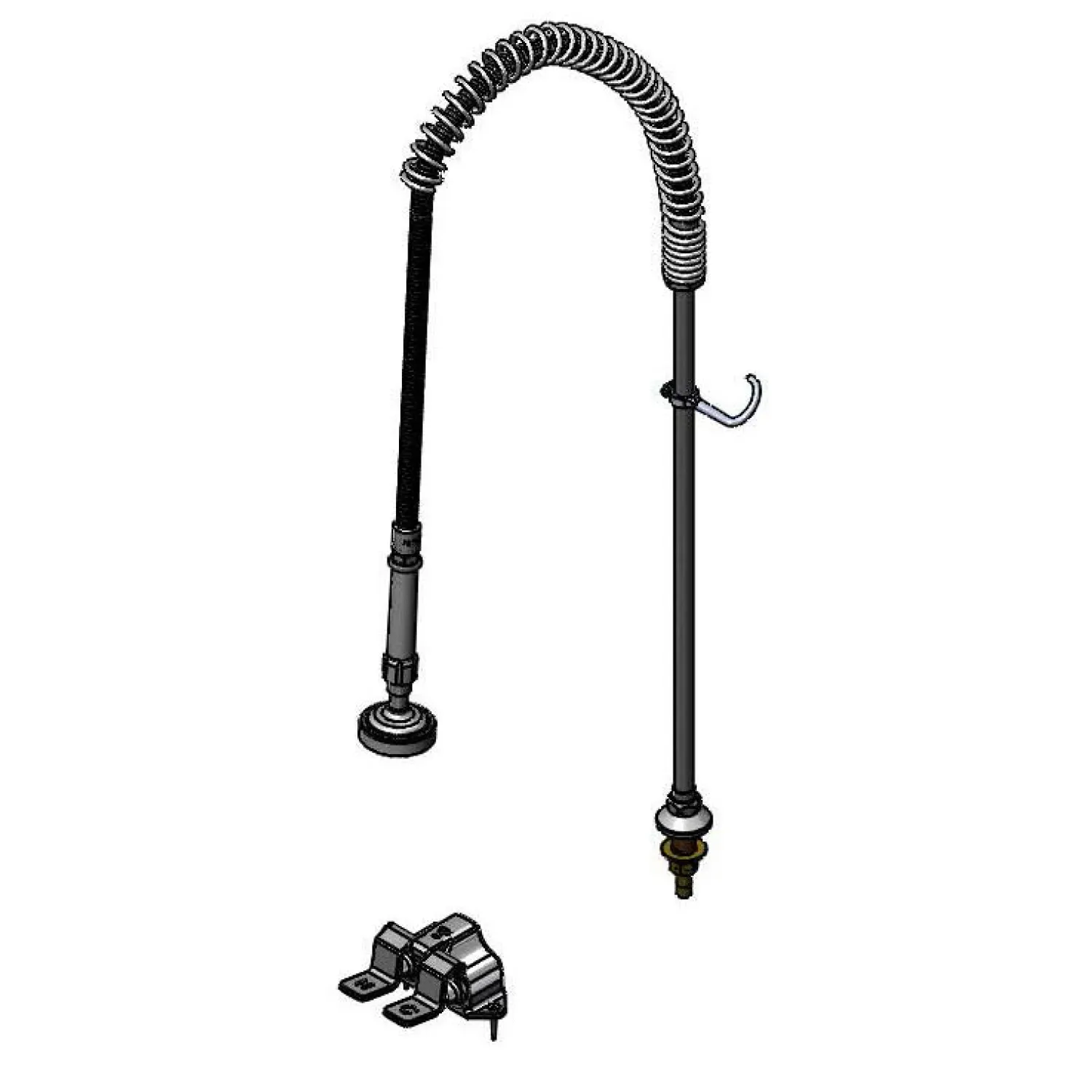 Optimize system operation with the T&S Brass B-0153 Pre-Rinse Faucet Assembly. Designed specifically for commercial restaurant use, this pre-rinse riser assembly features a spring action and a double pedal valve (B-0502) for efficient and convenient operation. The polished chrome plated brass bodies of the single hole deck mount dummy pre-rinse and pedal valve ensure durability and a sleek appearance. The easy-install 24" riser allows for quick installation, while the 44" flexible stainless steel hose with a heat-resistant gray handle provides flexibility and ease of use. With its high-quality construction and user-friendly design, this pre-rinse faucet assembly from T&S Brass is a reliable and practical choice for any commercial kitchen. Trust in T&S Brass, a trusted name in the industry, to enhance the efficiency and functionality of your restaurant's dishwashing process.