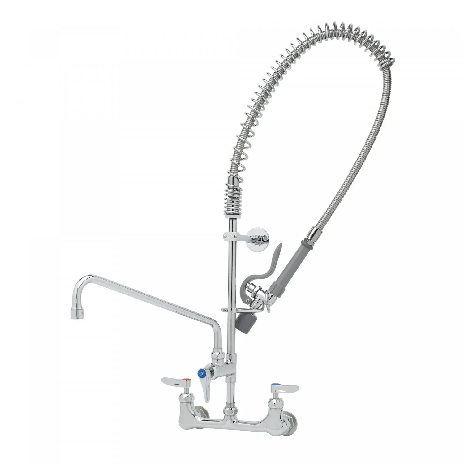 Maximize System Performance with the T&S Brass B-0154-14-CR-BC Pre-Rinse Faucet Assembly, with Add On Faucet. This commercial-grade faucet is designed to enhance efficiency and productivity in any restaurant setting. The 8" wall mount Ceramas pre-rinse unit features a 14" swing nozzle and a B-0107-C spray valve, ensuring powerful and precise cleaning. With a pressure range of 20 - 125 psi and a temperature range of 40°F - 140°F, this faucet can handle the toughest cleaning tasks. The spray valve has a flow rate of 0.65 GPM at 60 psi, providing optimal water conservation without compromising performance. Built by T&S Brass, a trusted name in the industry, this pre-rinse faucet assembly is packed with quality and durability. Whether you're washing dishes or prepping ingredients, this faucet will help you maintain a clean and efficient kitchen. Upgrade your restaurant's cleaning system with the T&S Brass B-0154-14-CR-BC Pre-Rinse Faucet Assembly, with Add On Faucet.