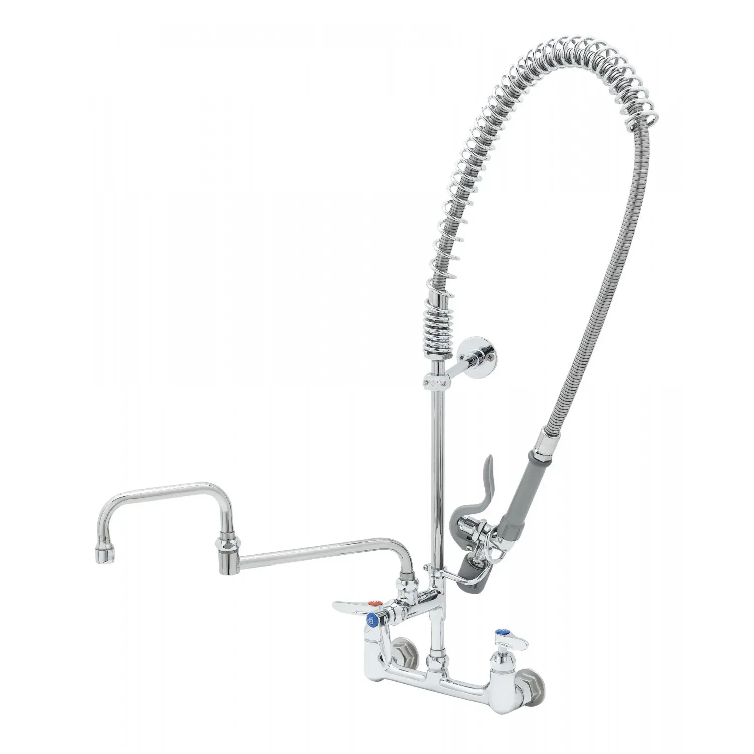 Facilitate Equipment Use with the T&S Brass, B-0154-CR-C Pre-Rinse Faucet Assembly, with Add On Faucet. This commercial-grade pre-rinse faucet is designed to enhance efficiency and convenience in any restaurant kitchen. The 8" wall mount design ensures stability and durability, while the Ceramas coating provides a sleek and easy-to-clean surface. The B-0155-LNEZ & 074X double-joint nozzle offers flexibility and precision, allowing for targeted rinsing and cleaning. With a pressure range of 20 - 125 psi and a temperature range of 40°F - 140°F, this faucet can handle the demands of a busy kitchen. The spray valve delivers a flow rate of 0.65 GPM at 60 psi, ensuring thorough cleaning while conserving water.