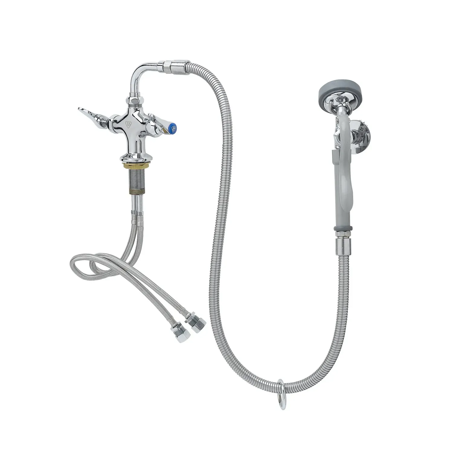 Facilitate Equipment Reliability with the T&S Brass B-0160 Faucet, with Spray Hose. This single hole deck mount mixing faucet is designed to enhance efficiency and durability in commercial restaurant settings. The polished chrome plated brass body ensures long-lasting performance, while the 44" flexible stainless steel hose with a heat-resistant gray handle and hold down ring provides ease of use and maneuverability. The angled spray valve, with a flow rate of 1.15 GPM, allows for precise control and efficient cleaning. Whether you need to rinse dishes, clean countertops, or fill large pots, this faucet is up to the task. With its reliable construction and user-friendly design, the T&S Brass B-0160 Faucet, with Spray Hose, is a must-have for any commercial kitchen. Trust in T&S Brass for quality and dependability.