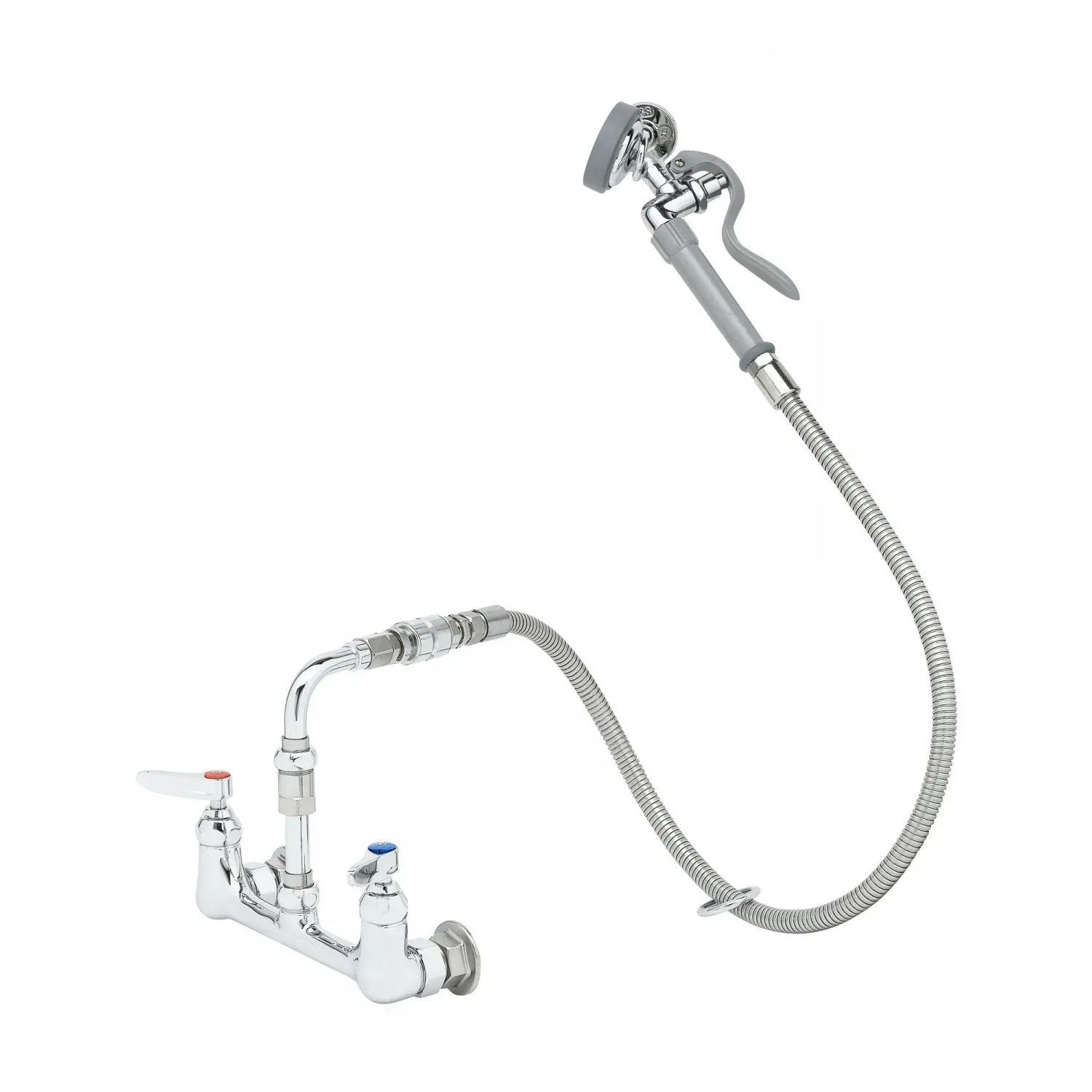 Upgrade Operational Reliability with the T&S Brass B-0167-HH Faucet with Spray Hose. This 8" wall mount faucet is designed to enhance efficiency and durability in commercial restaurant settings. With its polished chrome plated brass body, it not only adds a sleek touch to your kitchen but also ensures long-lasting performance. The 90-degree swivel feature allows for easy maneuverability, while the vacuum breaker prevents backflow contamination. The faucet comes with a 44" flexible stainless steel hose, complete with a heat-resistant gray handle and hold down ring, providing versatility and ease of use. Whether you need to rinse dishes, clean produce, or fill large pots, the B-0167-HH is up to the task. Trust T&S Brass, a reputable vendor known for their quality products, to deliver a reliable and efficient solution for your restaurant's needs.