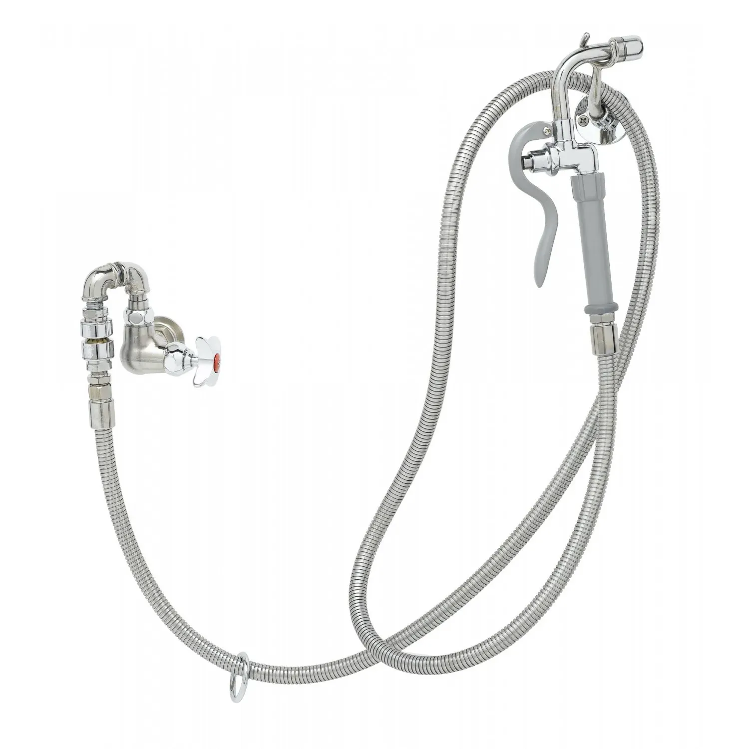Maximize System Performance with the T&S Brass B-0169-102C-96H Pre-Rinse Faucet Assembly. Designed specifically for commercial restaurant use, this wall mount unit is a game-changer in the kitchen. With its single temperature control, you can easily adjust the water to suit your needs, ensuring optimal performance and efficiency. The included spray nozzle and aerator provide a powerful stream of water, perfect for rinsing dishes and cleaning surfaces. The 96" flexible stainless steel hose with a heat-resistant gray handle and hold-down ring offers maximum maneuverability and durability. Plus, the vacuum breaker prevents backflow contamination, ensuring the safety of your water supply. This pre-rinse faucet assembly is packed with features that make it a must-have for any busy restaurant kitchen. Trust T&S Brass for quality and reliability. Upgrade your kitchen with the B-0169-102C-96H Pre-Rinse Faucet Assembly today.