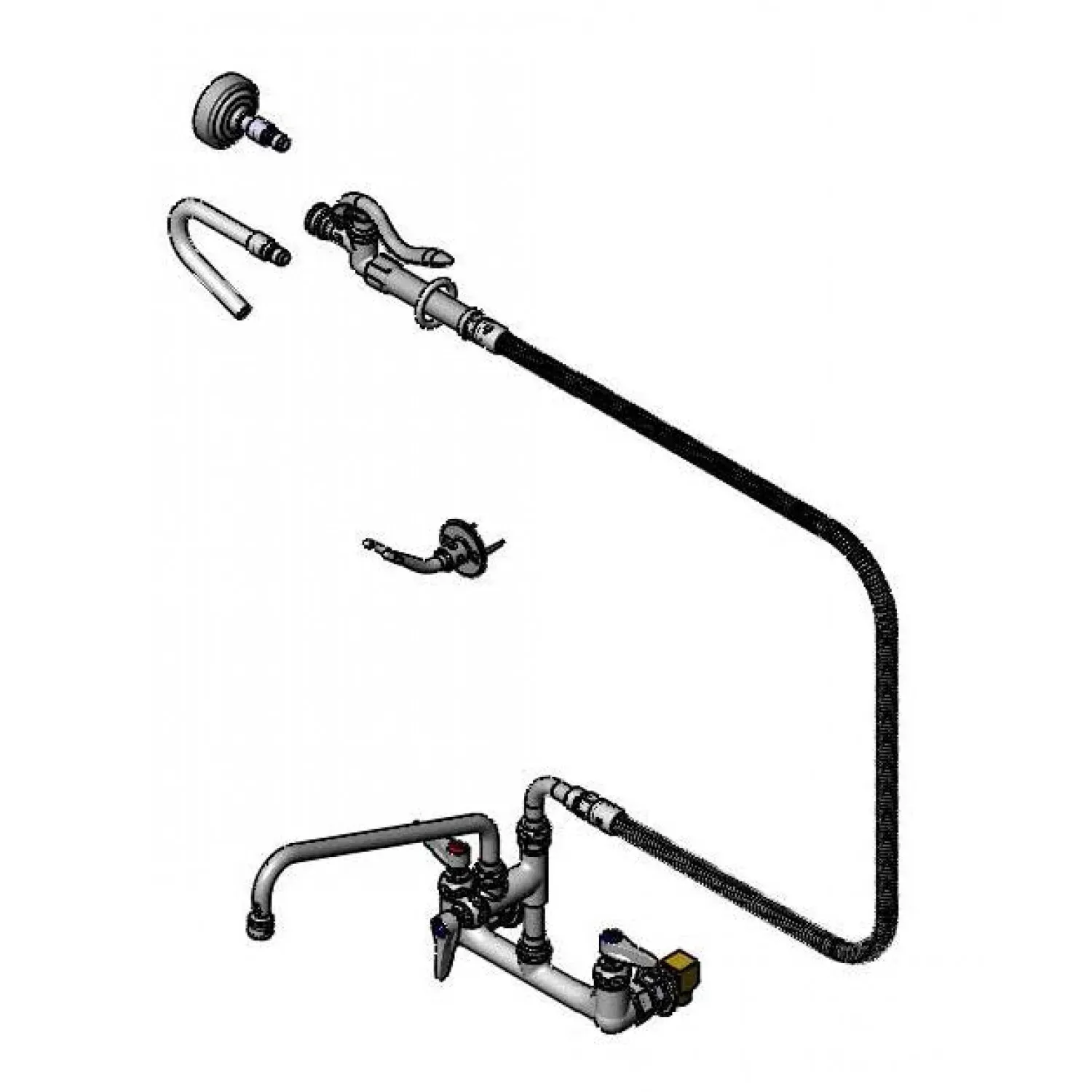 Upgrade Equipment Efficiency with the T&S Brass B-0175-60H-QDSV Faucet, with Spray Hose. This 8" wall mount faucet is designed for commercial restaurant use, offering a polished chrome plated brass body for durability and a sleek appearance. The faucet comes with an EasyInstall add-on faucet, allowing for easy installation and increased functionality. With a 12" swing nozzle and stream regulator outlet, this faucet provides precise control over water flow, making it ideal for various tasks in a busy kitchen. The SC Eternas series ensures long-lasting performance, while the included B-1420, B-1421, B-1424, and B-0060-H components add versatility to your setup. Whether you need to fill large pots or rinse dishes, this T&S Brass faucet delivers reliable performance and efficiency. Upgrade your restaurant equipment with this high-quality faucet and experience enhanced productivity in your kitchen.