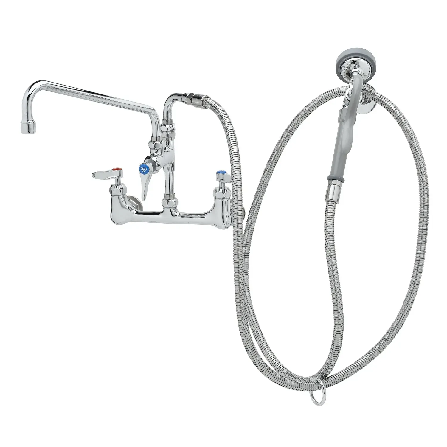 Secure Equipment Operation with T&S Brass, B-0175-CR, Faucet, with Spray Hose. This pre-rinse faucet is designed to ensure efficient and reliable operation in commercial restaurant settings. With an 8" wall mount base and lever handles, it offers easy control and maneuverability. The faucet features a Ceramas cartridge for long-lasting durability and a polished chrome plated brass body for a sleek and professional look. The 12" swing nozzle with a stream regulator outlet allows for precise rinsing and cleaning. The easy-install add-on faucet provides additional functionality and convenience. This faucet is part of Series 1, known for its high-quality construction and performance. With T&S Brass, you can trust that your equipment will operate smoothly, allowing your staff to focus on delivering exceptional service. Upgrade your restaurant's kitchen with the T&S Brass B-0175-CR Faucet, with Spray Hose, and experience the difference in performance and reliability.