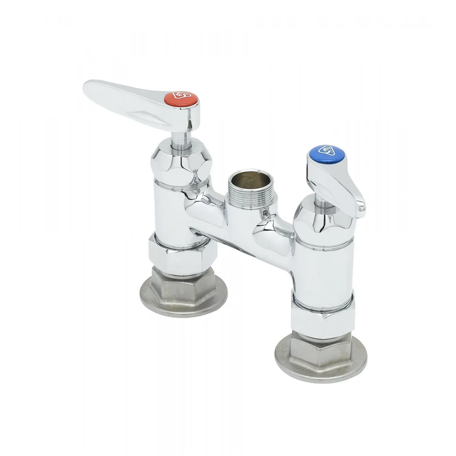 Secure Equipment Operation with T&S Brass, B-0225-CR-LN, Faucet, Deck Mount. This 4" c/c Deck Mount Faucet is designed to ensure smooth and reliable operation in commercial restaurant settings. With its Ceramas, Lever Handles, and 1/2" NPT Female Inlets, this faucet offers durability and convenience. The polished chrome plated brass body not only adds a touch of elegance to your establishment but also ensures long-lasting performance. The swivel outlet accepts standard T&S swing nozzles, providing flexibility and ease of use. Additionally, a lock washer is provided for rigid application, ensuring stability and preventing leaks. Whether you're washing dishes, filling pots, or rinsing produce, this T&S Brass faucet is a reliable choice. Trust in its quality craftsmanship and enjoy secure equipment operation in your commercial restaurant.