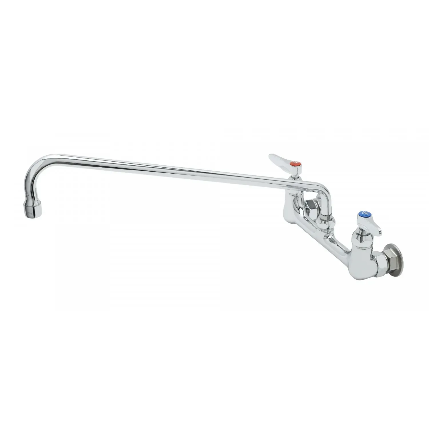 Upgrade System Performance with the T&S Brass B-0230-02 Faucet, Wall/Splash Mount. This high-quality 8" wall mount base faucet is designed to enhance efficiency and functionality in commercial restaurant settings. With its durable polished chrome plated brass body, this faucet is built to withstand the demands of a busy kitchen. The 18" swing nozzle provides flexibility and convenience, allowing for easy filling of large pots and pans. The lever handles offer precise control over water flow and temperature, ensuring optimal performance. The 2.2 GPM aerator helps conserve water while maintaining a strong, steady stream. Whether you're washing dishes, rinsing produce, or filling containers, this T&S Brass faucet is a reliable choice. Trust in its superior craftsmanship and enjoy the benefits of improved workflow and productivity in your restaurant.