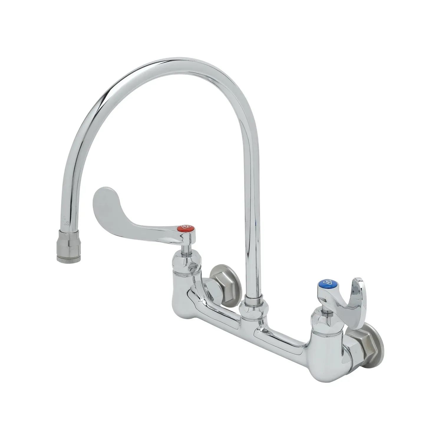 Improve equipment function with the T&S Brass B-0230-135X-WH4 Faucet, Wall/Splash Mount. This 8" wall mount mixing faucet is designed to enhance efficiency and convenience in commercial restaurant settings. With its Eterna cartridges and 4" wrist action handles, this faucet ensures smooth operation and precise control over water temperature and flow. The swivel gooseneck allows for easy maneuverability, making it ideal for various tasks such as filling pots and pans or rinsing dishes. The polished chrome plated brass body not only adds a sleek and professional look to your kitchen but also ensures durability and longevity. Whether you need to wash, rinse, or fill, this T&S Brass faucet is a reliable and efficient choice. Trust in its quality and performance to meet the demands of your busy restaurant kitchen.