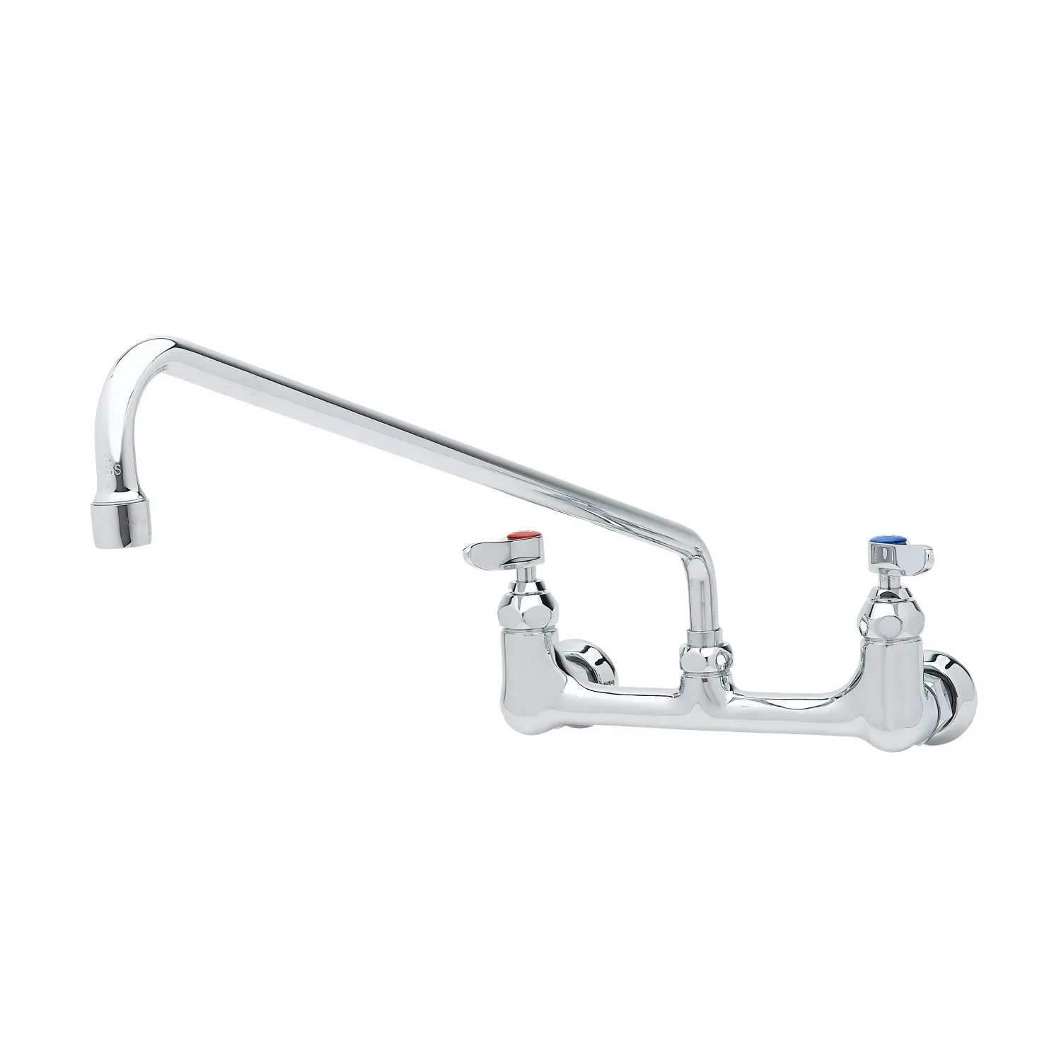 Maintain System Efficiency with the T&S Brass B-0230-EE Faucet, Wall/Splash Mount. This double pantry faucet is designed specifically for commercial restaurant use, ensuring optimal performance and durability. With its 8" centers and 18" swing nozzle, this faucet provides convenient access to water for various tasks in the kitchen. The polished chrome plated brass body not only adds a sleek and professional look to your restaurant, but also ensures long-lasting reliability. The lock washer provided allows for rigid application, further enhancing the faucet's stability. Whether you need to fill large pots or rinse off dishes, the T&S Brass B-0230-EE Faucet is up to the task. Trust in its quality construction and user-friendly design to maintain system efficiency in your restaurant. Upgrade your kitchen with this reliable and versatile wall/splash mount faucet.