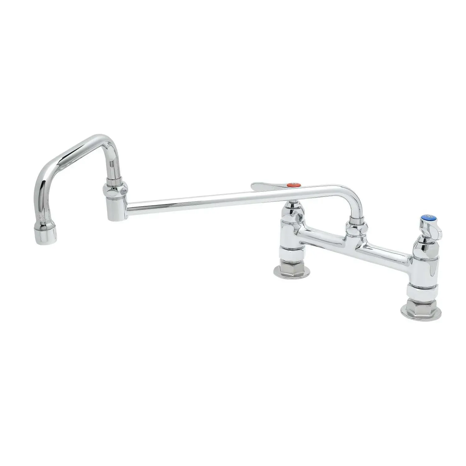 Upgrade Operational Reliability with the T&S Brass, B-0245, Faucet, Deck Mount. This commercial-grade faucet is designed to enhance efficiency and durability in any restaurant setting. With its 8" deck mount and polished chrome plated brass body, this faucet not only adds a touch of elegance to your kitchen but also ensures long-lasting performance. The 18" double-joint swing nozzle, featuring a 12" back nozzle and a 6" front nozzle, provides flexibility and convenience for various tasks, from filling large pots to rinsing dishes. The included lock washer allows for rigid application, ensuring stability during heavy use. Whether you're running a bustling restaurant or a busy catering service, this T&S Brass faucet is a reliable choice that will withstand the demands of a commercial kitchen. Upgrade your operational reliability today with the T&S Brass, B-0245, Faucet, Deck Mount.