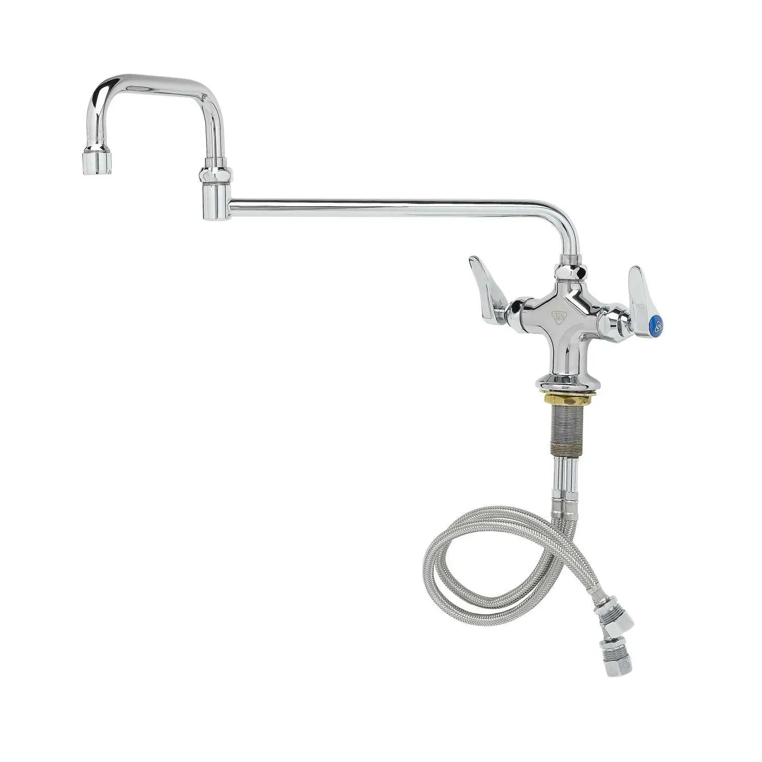 Optimize Equipment Use with the T&S Brass, B-0250, Faucet, Pantry. This commercial-grade double pantry faucet is designed to enhance efficiency and functionality in restaurant kitchens. With its single hole base and 18" double-joint swing nozzle, this faucet allows for easy maneuverability and precise water flow control. The polished chrome plated brass body not only adds a sleek and professional look to any commercial kitchen but also ensures durability and longevity. The lock washer provided allows for rigid application, ensuring a secure and stable installation. Whether you're rinsing produce, filling large pots, or washing dishes, this T&S Brass faucet is up to the task. Its user-friendly design and high-quality construction make it an essential tool for any busy restaurant. Upgrade your kitchen with the T&S Brass, B-0250, Faucet, Pantry and experience improved efficiency and reliability in your daily operations.
